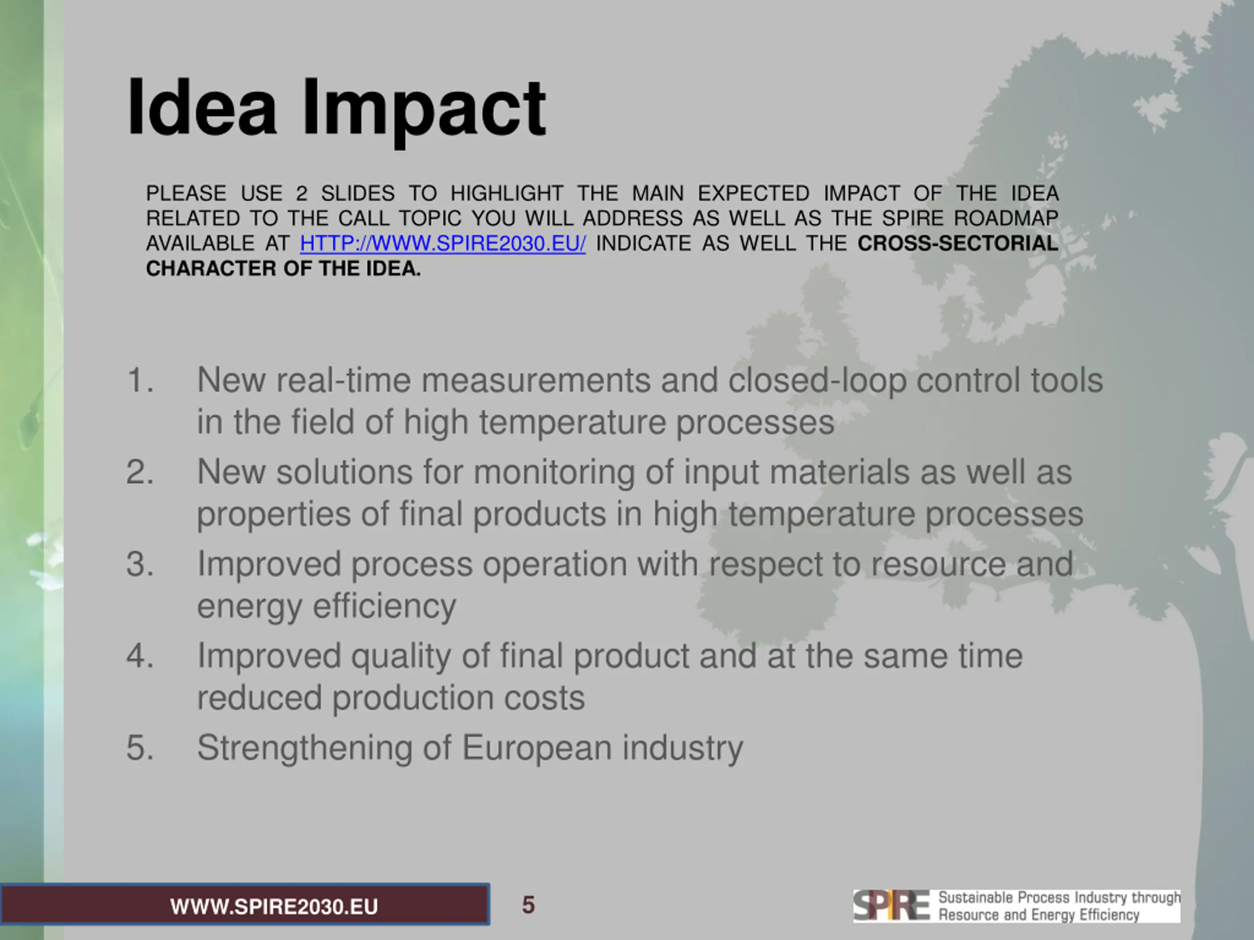 Idea Impact PLEASE USE 2 SLIDES TO HIGHLIGHT THE MAIN EXPECTED IMPACT OF THE IDEA RELATED TO THE CALL TOPIC YOU WILL ADDRESS AS WELL AS THE SPIRE ROADMAP AVAILABLE AT HTTP://WWW.SPIRE2030.EU/ INDICATE AS WELL THE CROSS-SECTORIAL CHARACTER OF THE IDEA. 1. New real-time measurements and closed-loop control tools in the field of high temperature processes New solutions for monitoring of input materials as well as properties of final products in high temperature processes Improved process operation with respect to resource and energy efficiency Improved quality of final product and at the same time reduced production costs Strengthening of European industry 2. 3. 4. 5. 5 WWW.SPIRE2030.EU