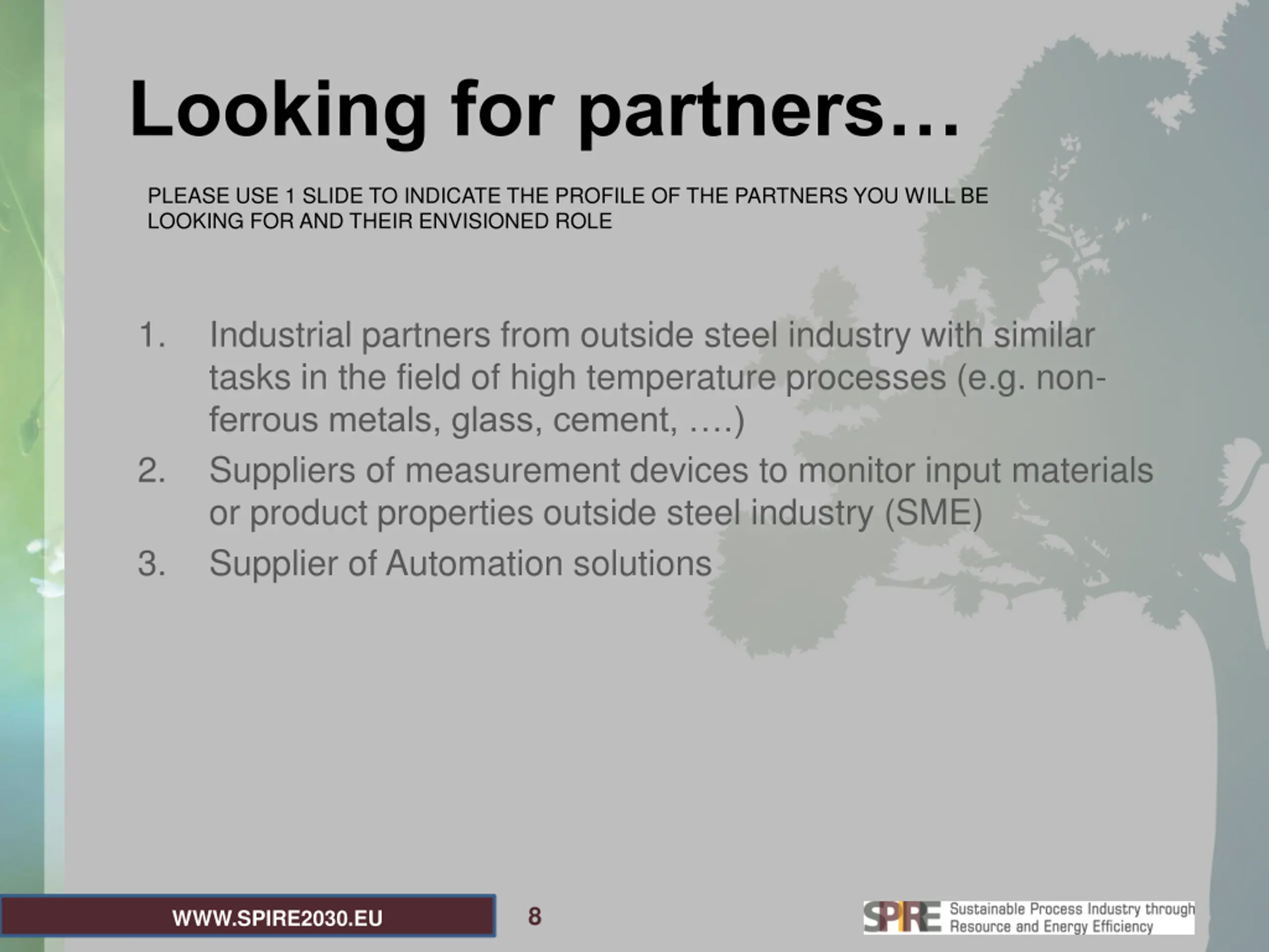 Existing Project Consortium PLEASE USE 1 SLIDE TO INDICATE THE EXISTING PROJECT CONSORTIUM AS WELL AS THE MAIN ROLE OF THE PARTNERS. 1. 2. 3. 4. BFI as applied research institute Industrial partners from steel industry Research partners from steel industry Supplier of measurements devices (SME) 7 WWW.SPIRE2030.EU