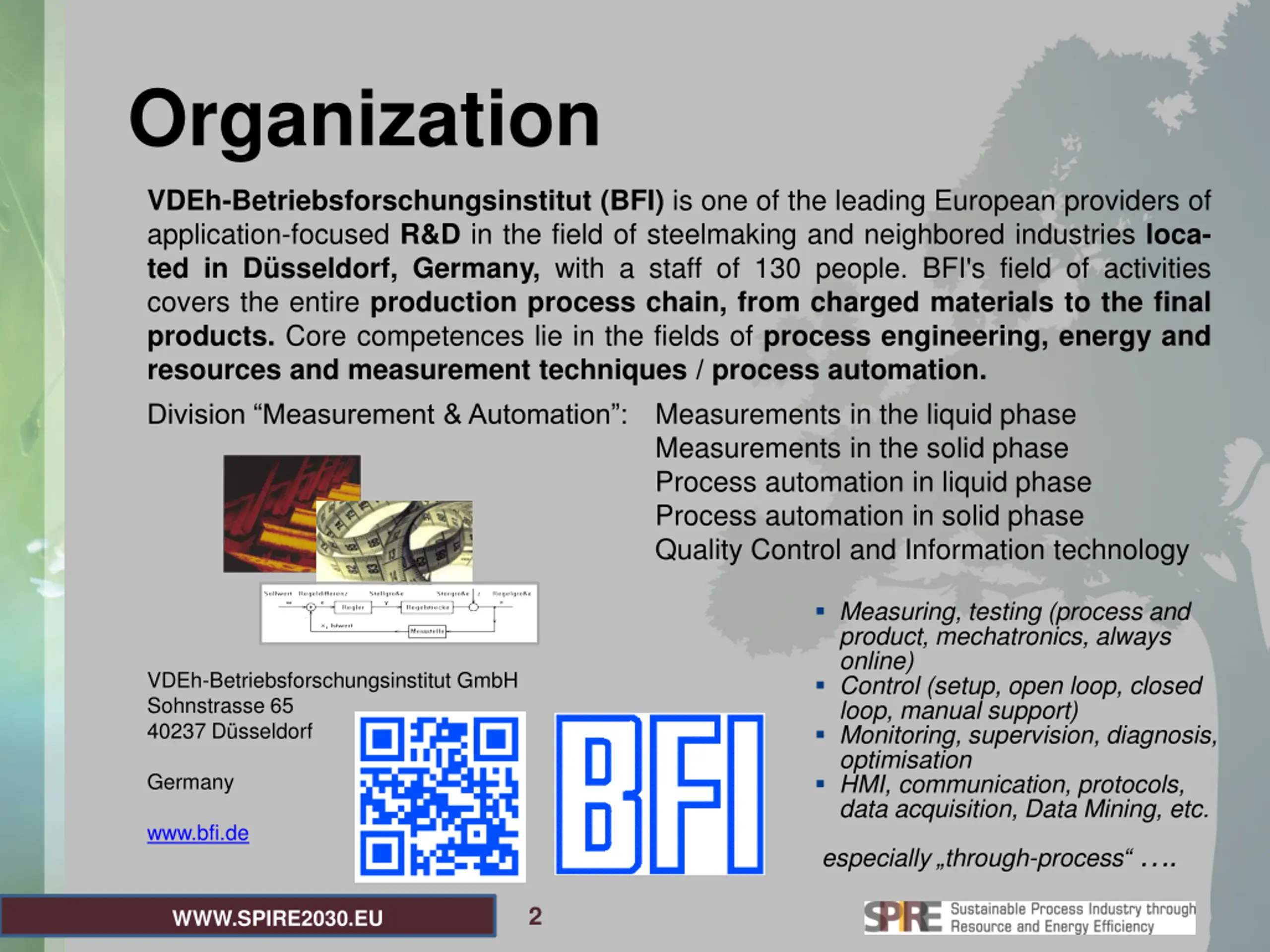 Organization VDEh-Betriebsforschungsinstitut (BFI) is one of the leading European providers of application-focused R&D in the field of steelmaking and neighbored industries loca- ted in D sseldorf, Germany, with a staff of 130 people. BFI's field of activities covers the entire production process chain, from charged materials to the final products. Core competences lie in the fields of process engineering, energy and resources and measurement techniques / process automation. Division Measurement & Automation : Measurements in the liquid phase Measurements in the solid phase Process automation in liquid phase Process automation in solid phase Quality Control and Information technology Measuring, testing (process and product, mechatronics, always online) Control (setup, open loop, closed loop, manual support) Monitoring, supervision, diagnosis, optimisation HMI, communication, protocols, data acquisition, Data Mining, etc. VDEh-Betriebsforschungsinstitut GmbH Sohnstrasse 65 40237 D sseldorf Germany www.bfi.de especially through-process . 2 WWW.SPIRE2030.EU