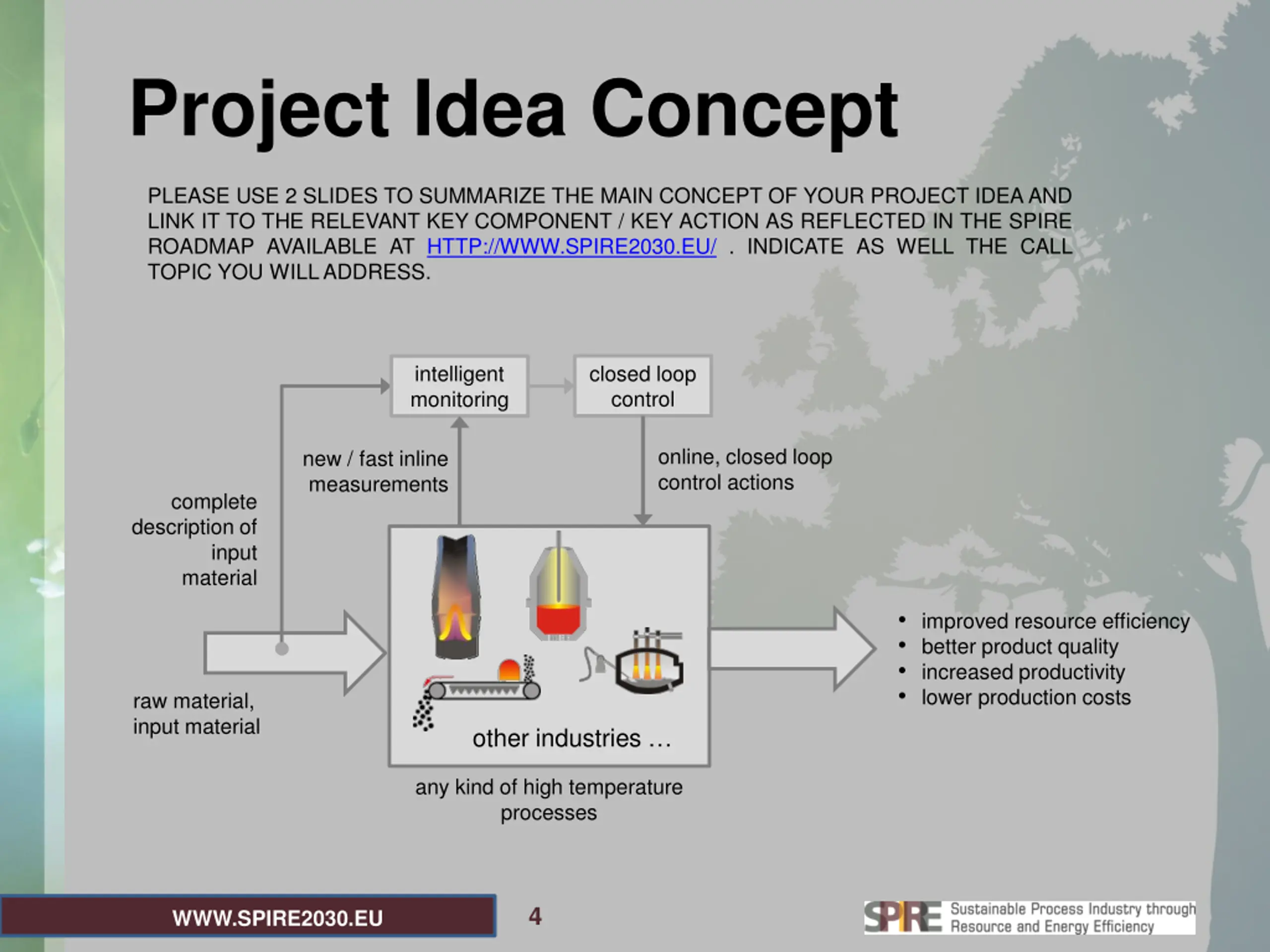Project Idea Concept PLEASE USE 2 SLIDES TO SUMMARIZE THE MAIN CONCEPT OF YOUR PROJECT IDEA AND LINK IT TO THE RELEVANT KEY COMPONENT / KEY ACTION AS REFLECTED IN THE SPIRE ROADMAP AVAILABLE AT HTTP://WWW.SPIRE2030.EU/ . INDICATE AS WELL THE CALL TOPIC YOU WILLADDRESS. closed loop control intelligent monitoring online, closed loop control actions new / fast inline measurements complete description of input material improved resource efficiency better product quality increased productivity lower production costs raw material, input material other industries any kind of high temperature processes 4 WWW.SPIRE2030.EU