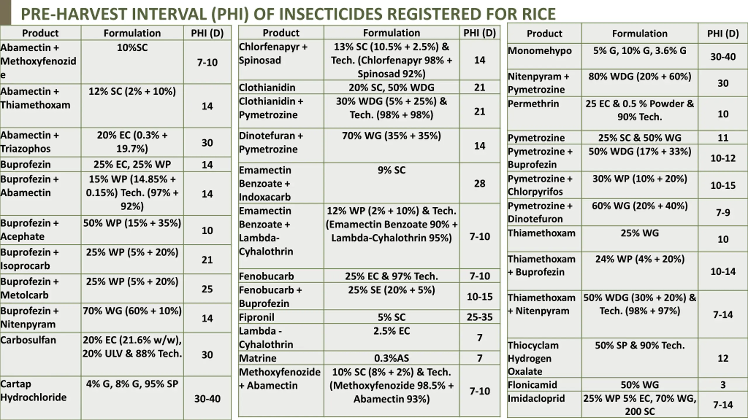 PRE-HARVEST INTERVAL (PHI) OF INSECTICIDES REGISTERED FOR RICE Product Formulation PHI (D) Product Formulation 10%SC PHI (D) Product Formulation PHI (D) Chlorfenapyr+ Spinosad 13% SC (10.5% + 2.5%) & Tech. (Chlorfenapyr98% + Spinosad92%) 20% SC, 50% WDG 30% WDG (5% + 25%) & Tech. (98% + 98%) Abamectin + Methoxyfenozid e Abamectin + Thiamethoxam Monomehypo 5% G, 10% G, 3.6% G 30-40 14 7-10 Nitenpyram + Pymetrozine Permethrin 80% WDG (20% + 60%) 30 21 Clothianidin Clothianidin + Pymetrozine 12% SC (2% + 10%) 25 EC & 0.5 % Powder & 90% Tech. 14 21 10 Abamectin + Triazophos Buprofezin Buprofezin + Abamectin 20% EC (0.3% + 19.7%) 25% EC, 25% WP 15% WP (14.85% + 0.15%) Tech. (97% + 92%) 50% WP (15% + 35%) Dinotefuran + Pymetrozine 70% WG (35% + 35%) Pymetrozine Pymetrozine + Buprofezin Pymetrozine + Chlorpyrifos Pymetrozine + Dinotefuron Thiamethoxam 25% SC & 50% WG 50% WDG (17% + 33%) 11 30 14 10-12 14 Emamectin Benzoate + Indoxacarb Emamectin Benzoate + Lambda- Cyhalothrin 9% SC 30% WP (10% + 20%) 28 10-15 14 60% WG (20% + 40%) 12% WP (2% + 10%) & Tech. (Emamectin Benzoate 90% + Lambda-Cyhalothrin95%) 7-9 Buprofezin + Acephate Buprofezin + Isoprocarb Buprofezin + Metolcarb Buprofezin + Nitenpyram Carbosulfan 10 25% WG 7-10 10 25% WP (5% + 20%) Thiamethoxam + Buprofezin 24% WP (4% + 20%) 21 10-14 7-10 Fenobucarb Fenobucarb + Buprofezin Fipronil Lambda - Cyhalothrin Matrine Methoxyfenozide + Abamectin 25% EC & 97% Tech. 25% SE (20% + 5%) 25% WP (5% + 20%) 25 10-15 Thiamethoxam + Nitenpyram 50% WDG (30% + 20%) & Tech. (98% + 97%) 70% WG (60% + 10%) 7-14 25-35 5% SC 2.5% EC 14 7 20% EC (21.6% w/w), 20% ULV & 88% Tech. Thiocyclam Hydrogen Oxalate Flonicamid Imidacloprid 50% SP & 90% Tech. 30 7 0.3%AS 12 10% SC (8% + 2%) & Tech. (Methoxyfenozide98.5% + Abamectin 93%) Cartap Hydrochloride 4% G, 8% G, 95% SP 50% WG 3 7-10 25% WP 5% EC, 70% WG, 200 SC 30-40 7-14