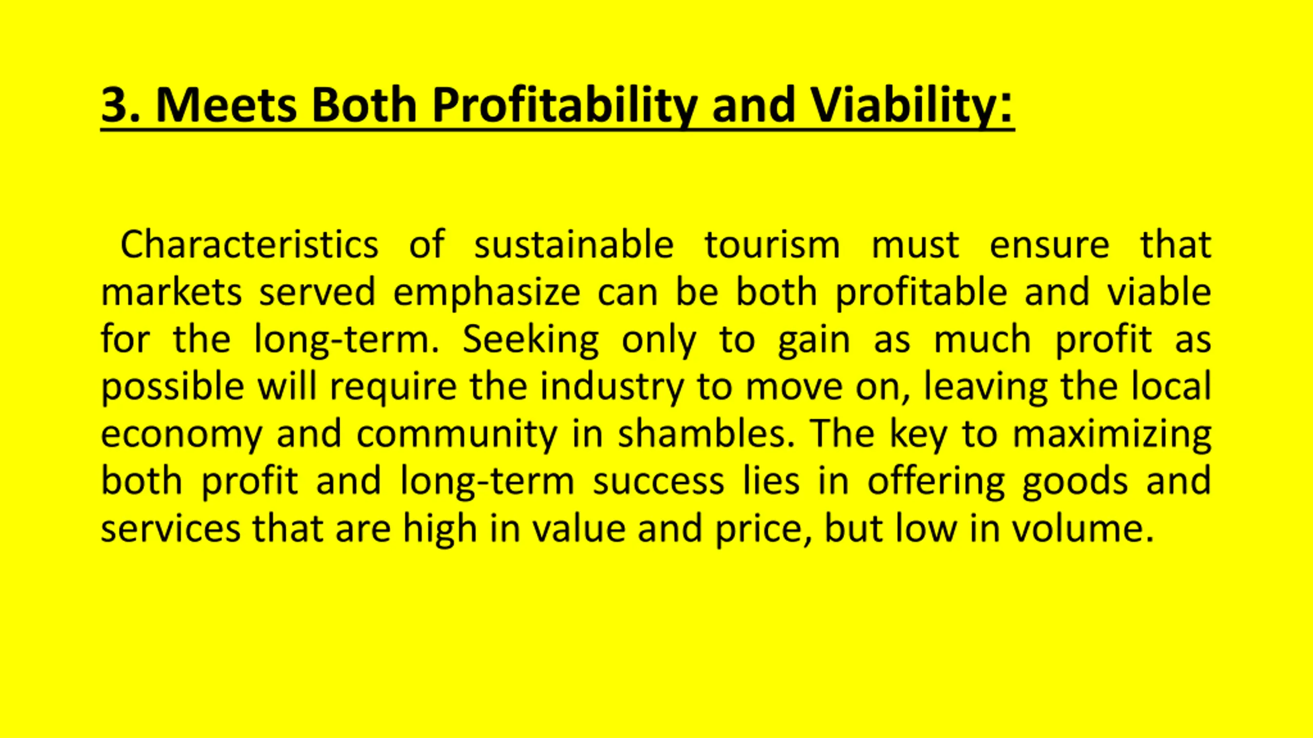 3. Meets Both Profitability and Viability: Characteristics of sustainable tourism must ensure that markets served emphasize can be both profitable and viable for the long-term. Seeking only to gain as much profit as possible will require the industry to move on, leaving the local economy and community in shambles. The key to maximizing both profit and long-term success lies in offering goods and services that are high in value and price, but low in volume.