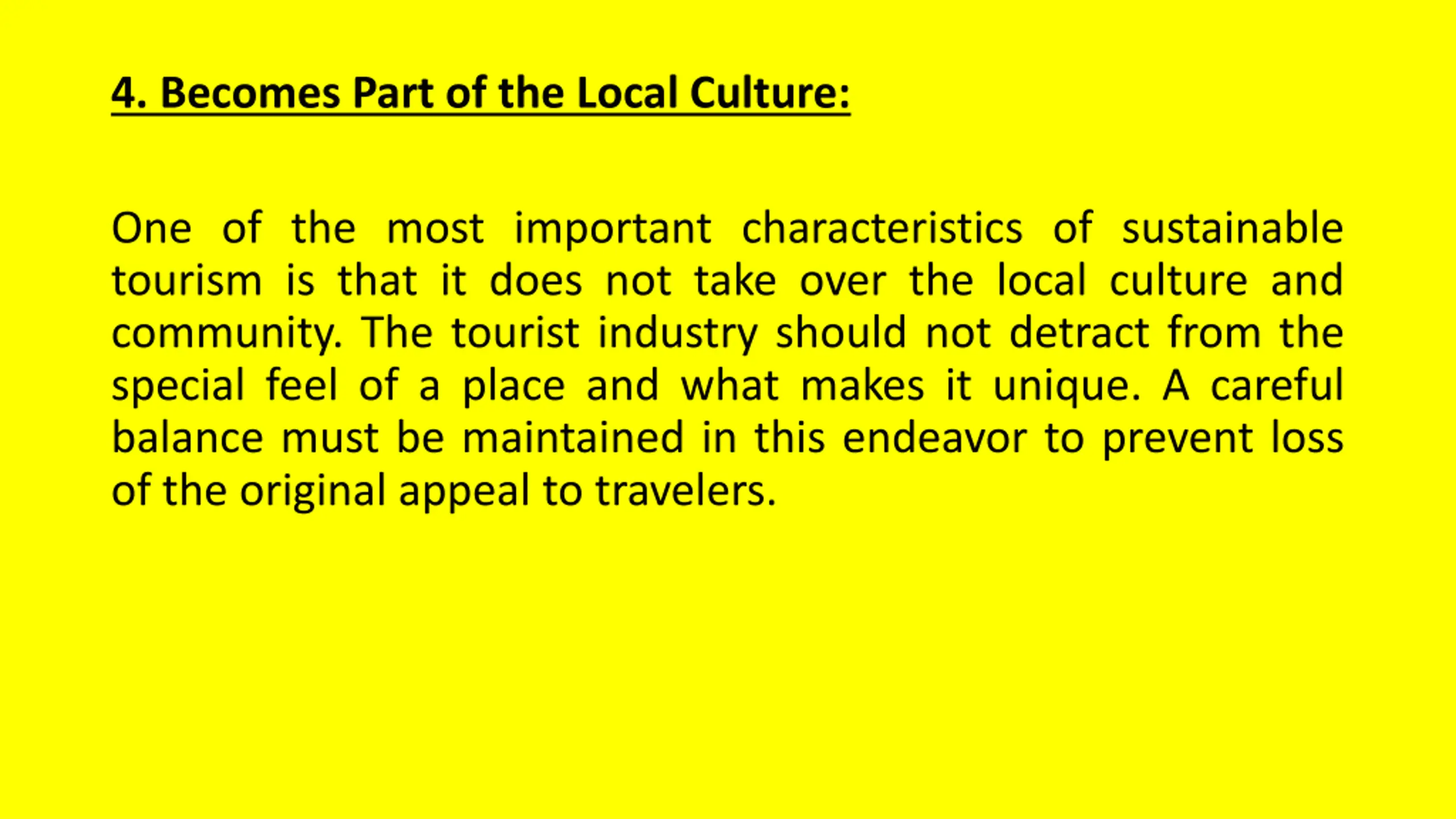 4. Becomes Part of the Local Culture: One of the most important characteristics of sustainable tourism is that it does not take over the local culture and community. The tourist industry should not detract from the special feel of a place and what makes it unique. A careful balance must be maintained in this endeavor to prevent loss of the original appeal to travelers.