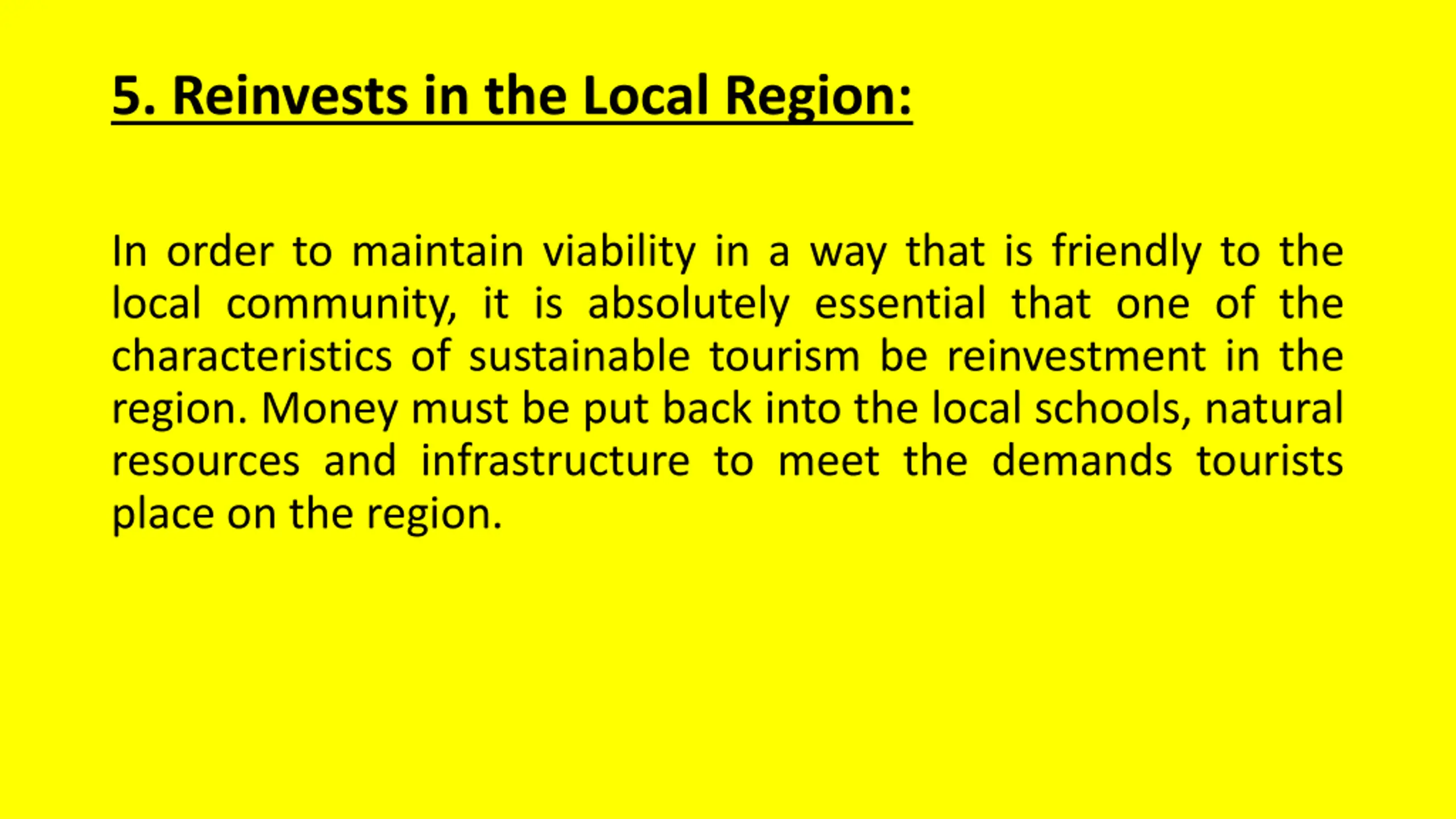 5. Reinvests in the Local Region: In order to maintain viability in a way that is friendly to the local community, it is absolutely essential that one of the characteristics of sustainable tourism be reinvestment in the region. Money must be put back into the local schools, natural resources and infrastructure to meet the demands tourists place on the region.