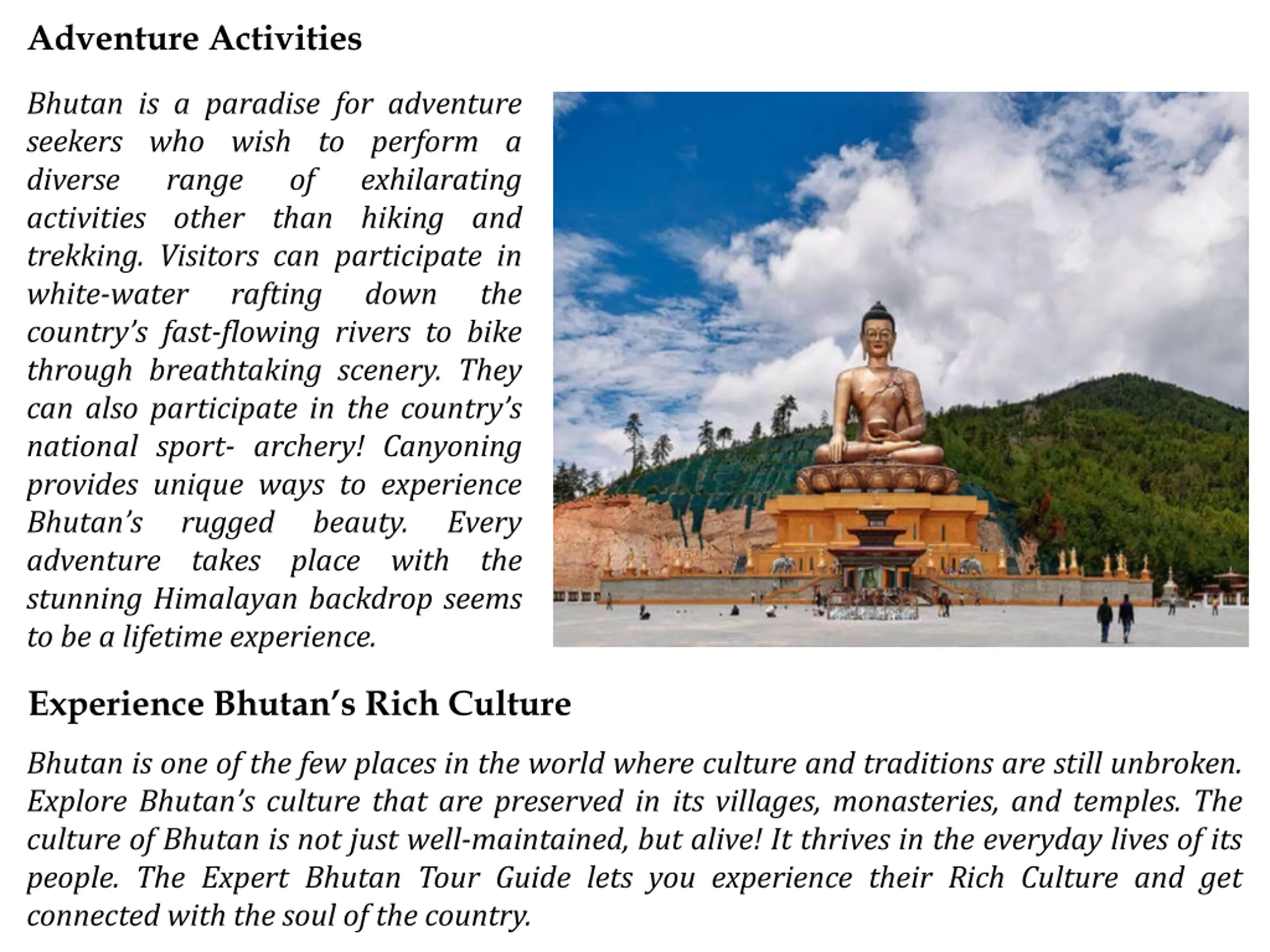 Adventure Activities Bhutan is a paradise for adventure seekers who wish to perform a diverse range activities other than hiking and trekking. Visitors can participate in white-water rafting country s fast-flowing rivers to bike through breathtaking scenery. They can also participate in the country s national sport- archery! Canyoning provides unique ways to experience Bhutan s rugged adventure takes place with the stunning Himalayan backdrop seems to be a lifetime experience. of exhilarating down the beauty. Every Experience Bhutan s Rich Culture Bhutan is one of the few places in the world where culture and traditions are still unbroken. Explore Bhutan s culture that are preserved in its villages, monasteries, and temples. The culture of Bhutan is not just well-maintained, but alive! It thrives in the everyday lives of its people. The Expert Bhutan Tour Guide lets you experience their Rich Culture and get connected with the soul of the country.