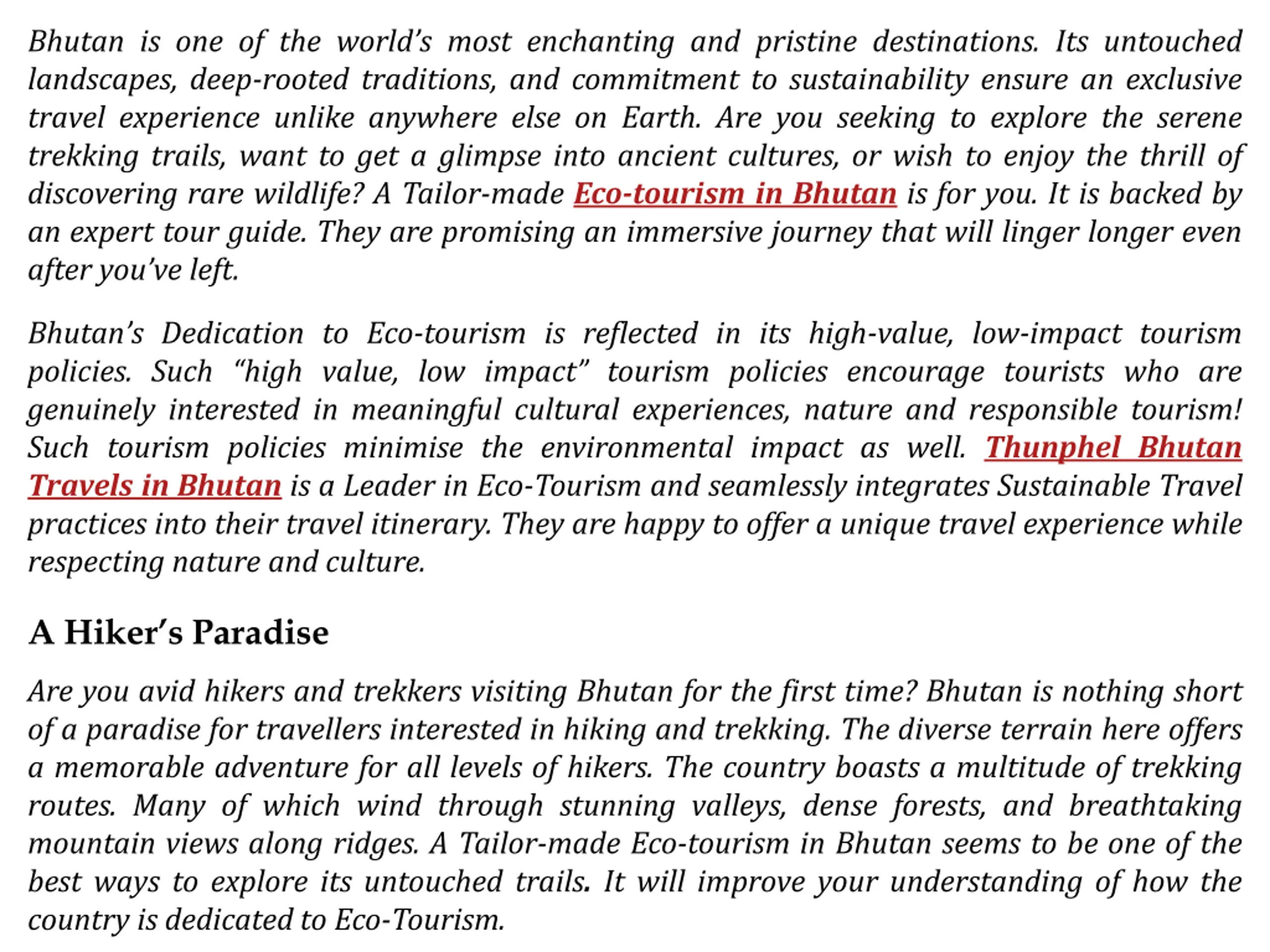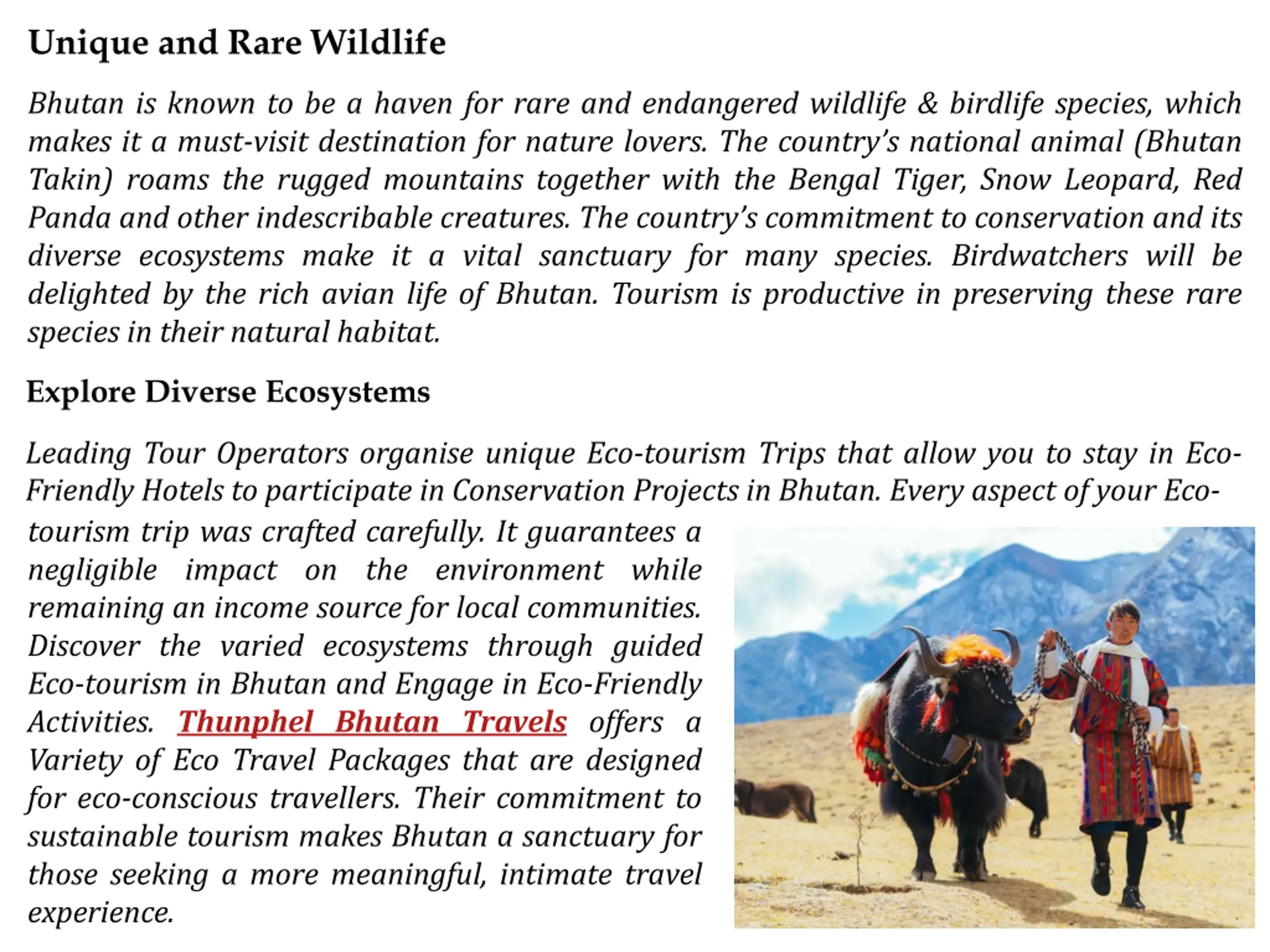 Bhutan is one of the worlds most enchanting and pristine destinations. Its untouched landscapes, deep-rooted traditions, and commitment to sustainability ensure an exclusive travel experience unlike anywhere else on Earth. Are you seeking to explore the serene trekking trails, want to get a glimpse into ancient cultures, or wish to enjoy the thrill of discovering rare wildlife? A Tailor-made Eco-tourism in Bhutan is for you. It is backed by an expert tour guide. They are promising an immersive journey that will linger longer even after you ve left. Bhutan s Dedication to Eco-tourism is reflected in its high-value, low-impact tourism policies. Such high value, low impact tourism policies encourage tourists who are genuinely interested in meaningful cultural experiences, nature and responsible tourism! Such tourism policies minimise the environmental impact as well. Thunphel Bhutan Travels in Bhutan is a Leader in Eco-Tourism and seamlessly integrates Sustainable Travel practices into their travel itinerary. They are happy to offer a unique travel experience while respecting nature and culture. A Hiker s Paradise Are you avid hikers and trekkers visiting Bhutan for the first time? Bhutan is nothing short of a paradise for travellers interested in hiking and trekking. The diverse terrain here offers a memorable adventure for all levels of hikers. The country boasts a multitude of trekking routes. Many of which wind through stunning valleys, dense forests, and breathtaking mountain views along ridges. A Tailor-made Eco-tourism in Bhutan seems to be one of the best ways to explore its untouched trails. It will improve your understanding of how the country is dedicated to Eco-Tourism.
