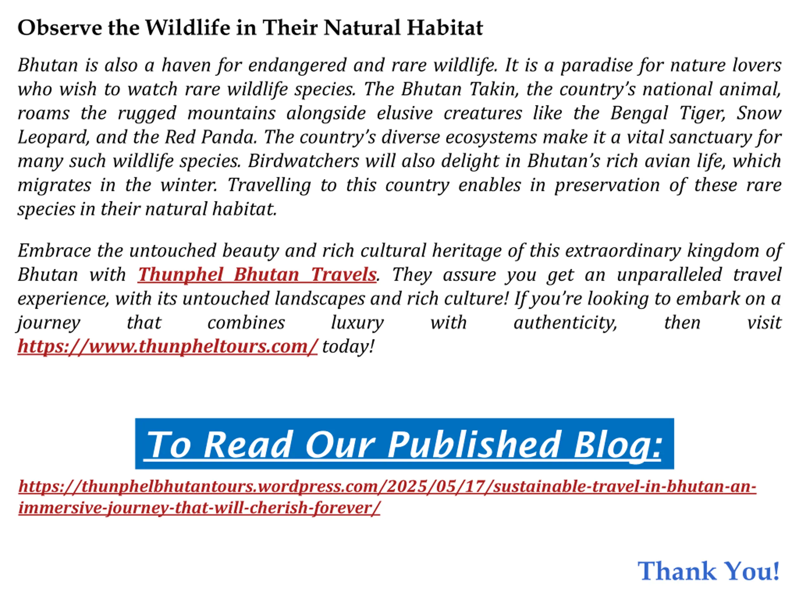 Observe the Wildlife in Their Natural Habitat Bhutan is also a haven for endangered and rare wildlife. It is a paradise for nature lovers who wish to watch rare wildlife species. The Bhutan Takin, the country s national animal, roams the rugged mountains alongside elusive creatures like the Bengal Tiger, Snow Leopard, and the Red Panda. The country s diverse ecosystems make it a vital sanctuary for many such wildlife species. Birdwatchers will also delight in Bhutan s rich avian life, which migrates in the winter. Travelling to this country enables in preservation of these rare species in their natural habitat. Embrace the untouched beauty and rich cultural heritage of this extraordinary kingdom of Bhutan with Thunphel Bhutan Travels. They assure you get an unparalleled travel experience, with its untouched landscapes and rich culture! If you re looking to embark on a journey that combines luxury https://www.thunpheltours.com/ today! with authenticity, then visit To Read Our Published Blog: https://thunphelbhutantours.wordpress.com/2025/05/17/sustainable-travel-in-bhutan-an- immersive-journey-that-will-cherish-forever/ Thank You!