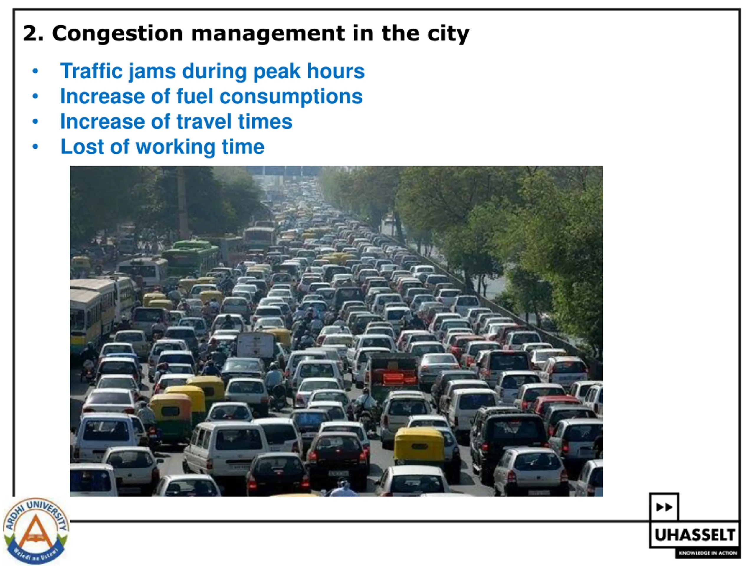 2. Congestion management in the city Traffic jams during peak hours Increase of fuel consumptions Increase of travel times Lost of working time