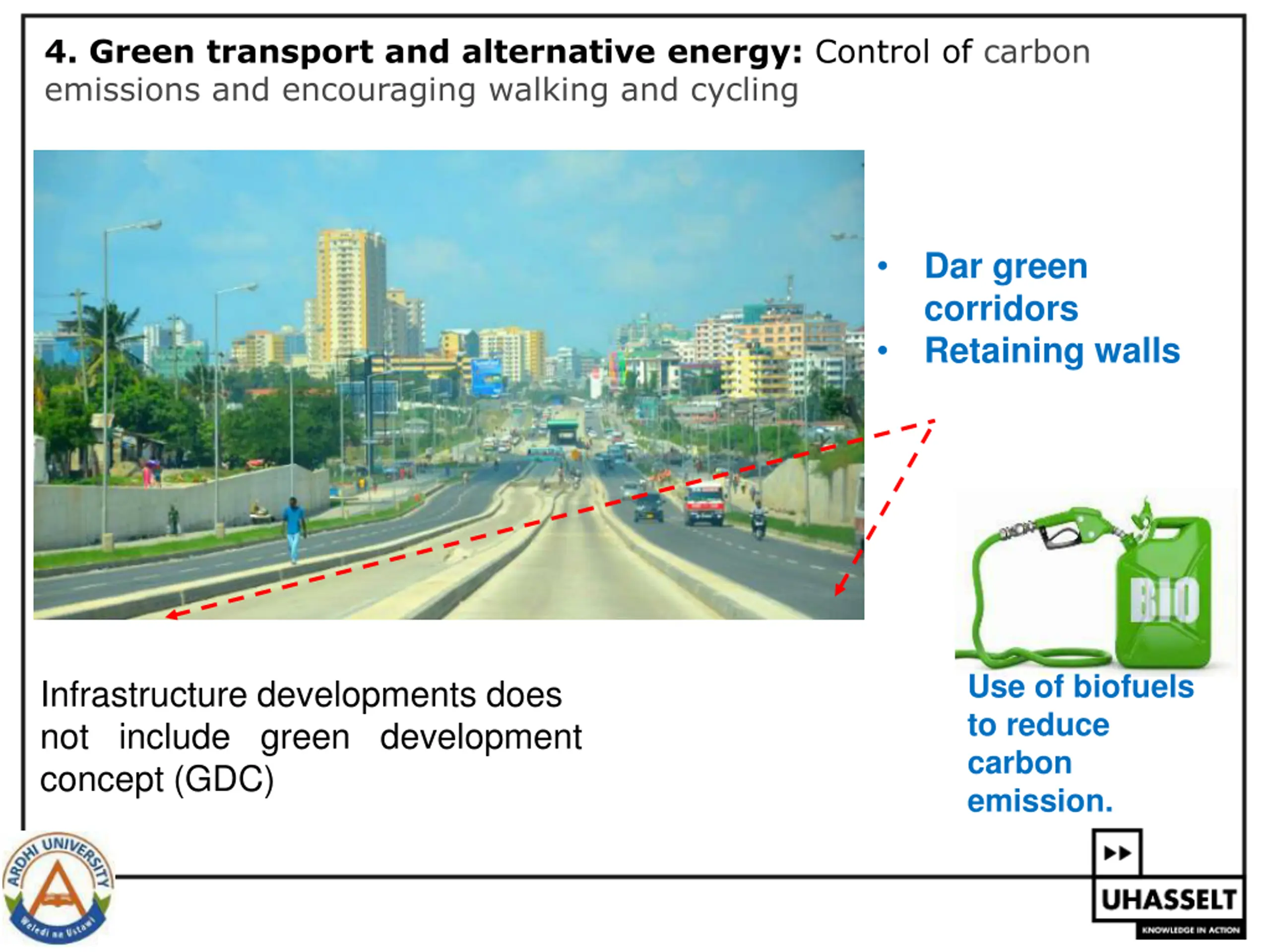 4. Green transport and alternative energy: Control of carbon emissions and encouraging walking and cycling Dar green corridors Retaining walls Use of biofuels to reduce carbon emission. Infrastructure developments does not include green development concept (GDC)