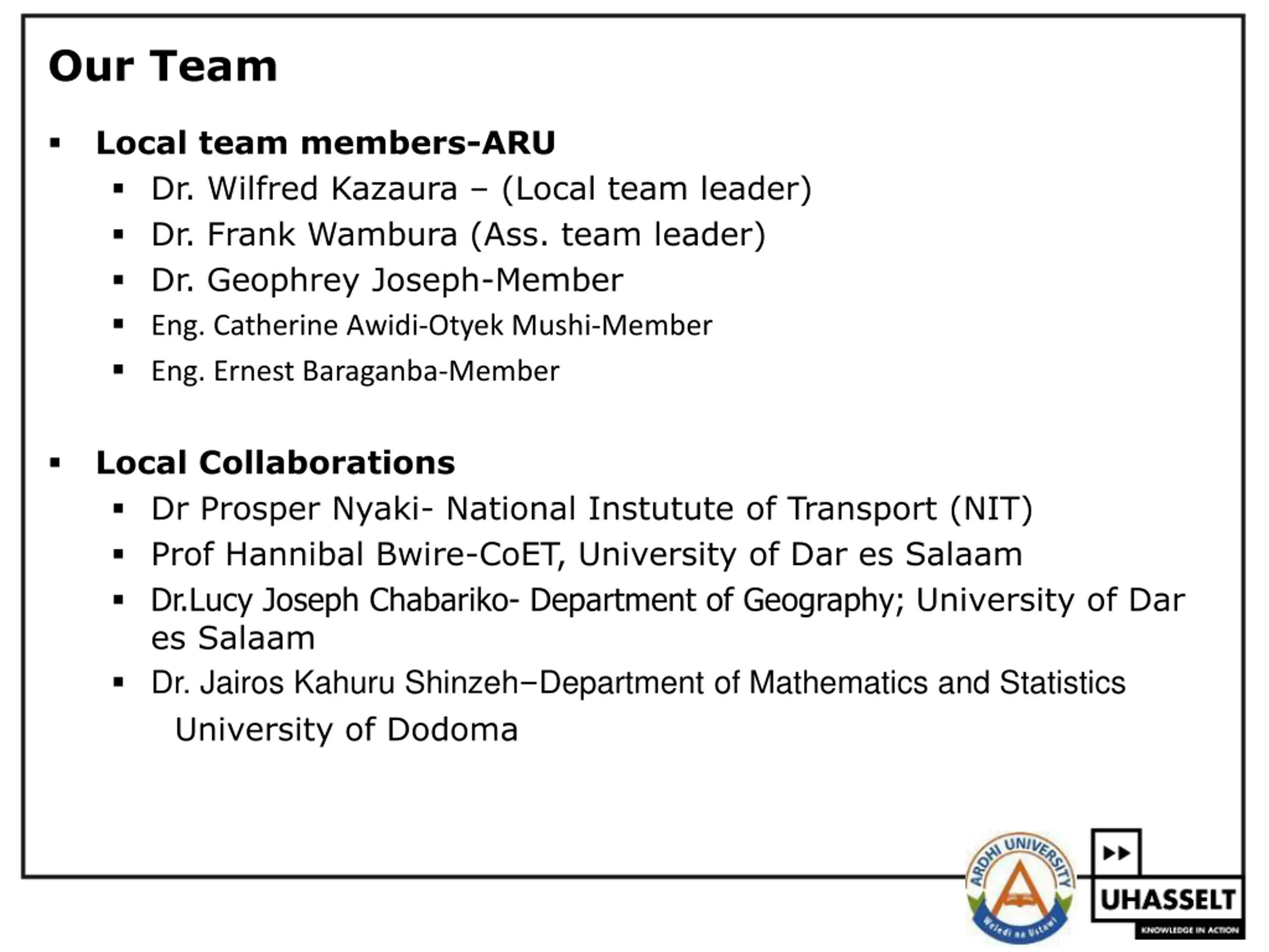 Our Team Local team members-ARU Dr. Wilfred Kazaura (Local team leader) Dr. Frank Wambura (Ass. team leader) Dr. Geophrey Joseph-Member Eng. Catherine Awidi-Otyek Mushi-Member Eng. Ernest Baraganba-Member Local Collaborations Dr Prosper Nyaki- National Instutute of Transport (NIT) Prof Hannibal Bwire-CoET, University of Dar es Salaam Dr.Lucy Joseph Chabariko- Department of Geography; University of Dar es Salaam Dr. Jairos Kahuru Shinzeh Department of Mathematics and Statistics University of Dodoma