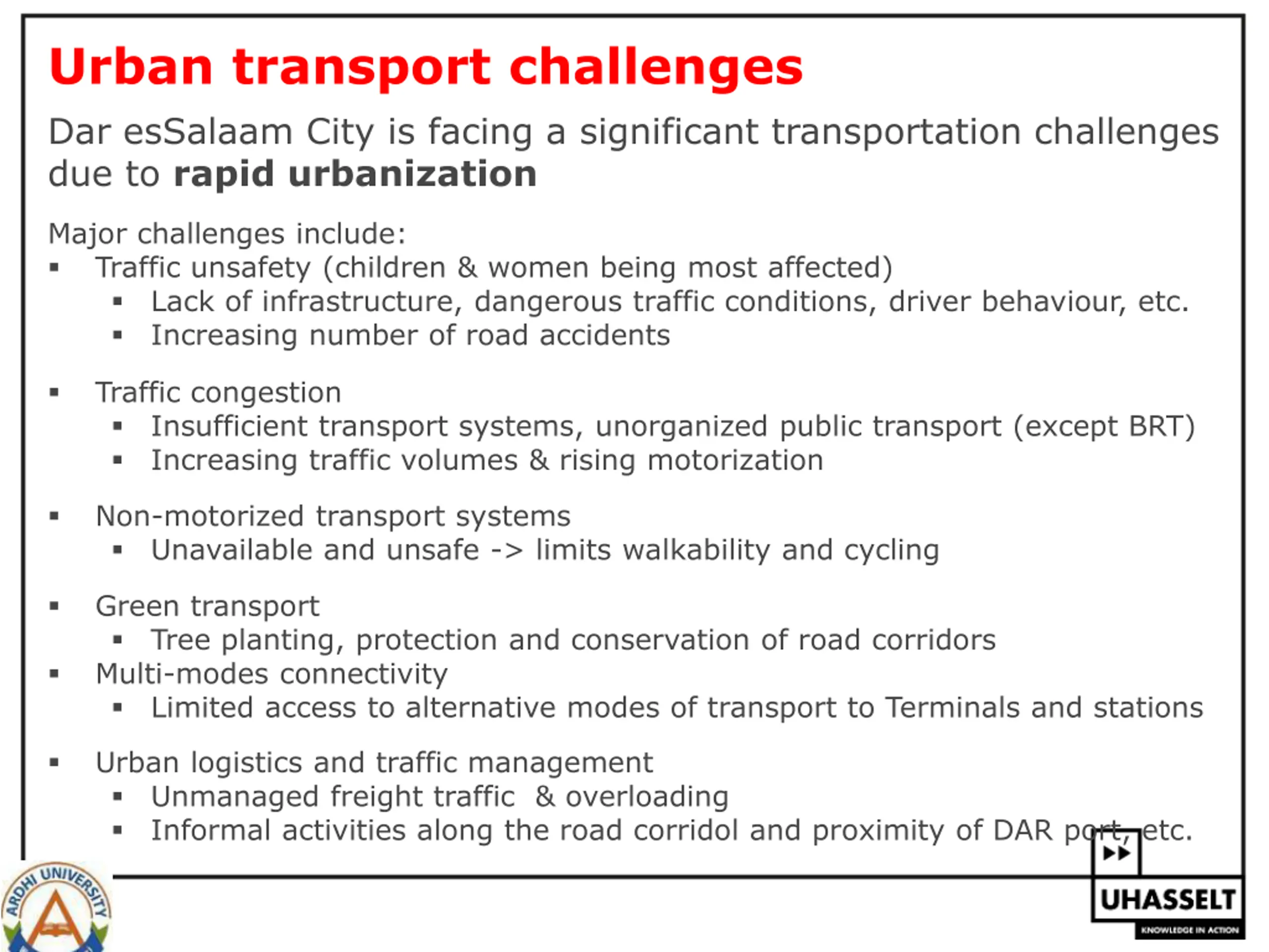 Urban transport challenges Dar esSalaam City is facing a significant transportation challenges due to rapid urbanization Major challenges include: Traffic unsafety (children & women being most affected) Lack of infrastructure, dangerous traffic conditions, driver behaviour, etc. Increasing number of road accidents Traffic congestion Insufficient transport systems, unorganized public transport (except BRT) Increasing traffic volumes & rising motorization Non-motorized transport systems Unavailable and unsafe -> limits walkability and cycling Green transport Tree planting, protection and conservation of road corridors Multi-modes connectivity Limited access to alternative modes of transport to Terminals and stations Urban logistics and traffic management Unmanaged freight traffic & overloading Informal activities along the road corridol and proximity of DAR port, etc.