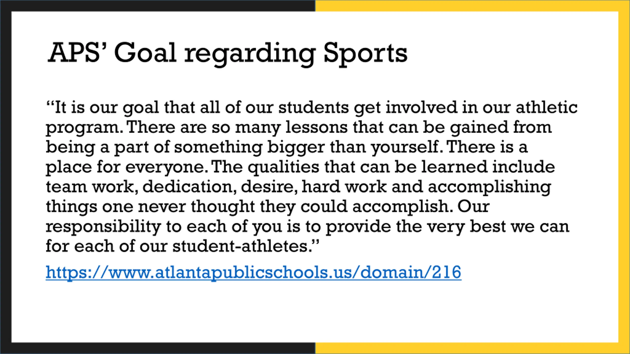 APS Goal regarding Sports It is our goal that all of our students get involved in our athletic program. There are so many lessons that can be gained from being a part of something bigger than yourself. There is a place for everyone. The qualities that can be learned include team work, dedication, desire, hard work and accomplishing things one never thought they could accomplish. Our responsibility to each of you is to provide the very best we can for each of our student-athletes. https://www.atlantapublicschools.us/domain/216