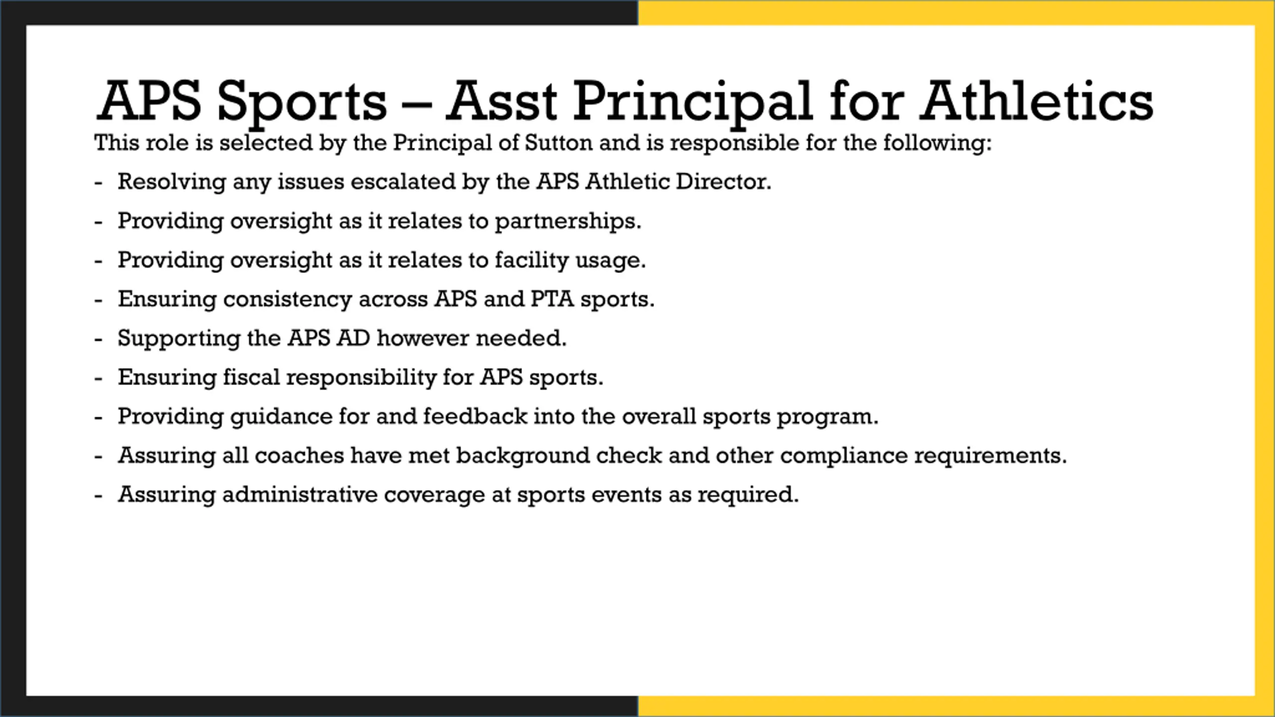 APS Sports Asst Principal for Athletics This role is selected by the Principal of Sutton and is responsible for the following: - Resolving any issues escalated by the APS Athletic Director. - Providing oversight as it relates to partnerships. - Providing oversight as it relates to facility usage. - Ensuring consistency across APS and PTA sports. - Supporting the APS AD however needed. - Ensuring fiscal responsibility for APS sports. - Providing guidance for and feedback into the overall sports program. - Assuring all coaches have met background check and other compliance requirements. - Assuring administrative coverage at sports events as required.