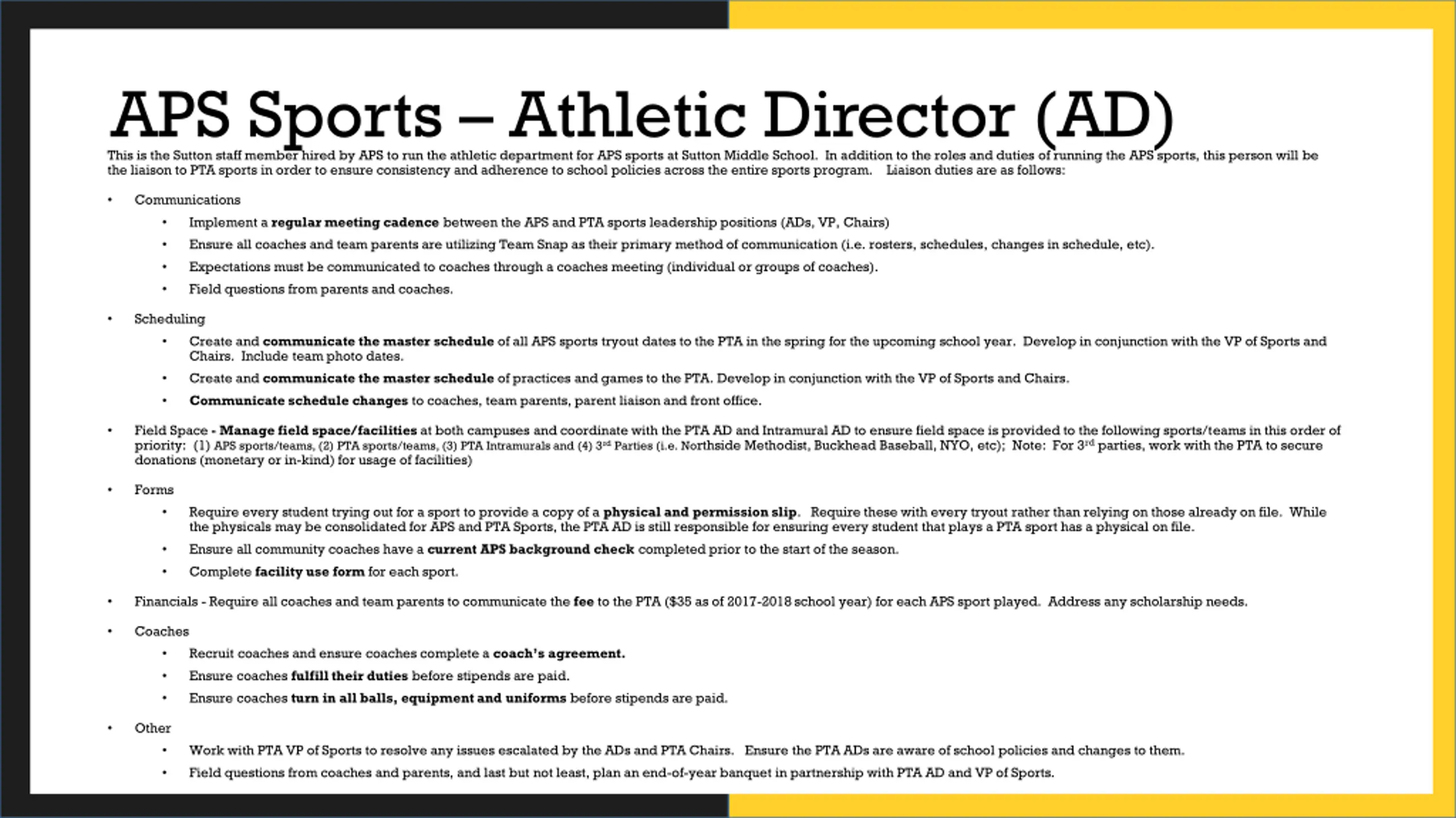 APS Sports Athletic Director (AD) This is the Sutton staff member hired by APS to run the athletic department for APS sports at Sutton Middle School. In addition to the roles and duties of running the APS sports, this person will be the liaison to PTA sports in order to ensure consistency and adherence to school policies across the entire sports program. Liaison duties are as follows: Communications Implement a regular meeting cadence between the APS and PTA sports leadership positions (ADs, VP, Chairs) Ensure all coaches and team parents are utilizing Team Snap as their primary method of communication (i.e. rosters, schedules, changes in schedule, etc). Expectations must be communicated to coaches through a coaches meeting (individual or groups of coaches). Field questions from parents and coaches. Scheduling Create and communicate the master schedule of all APS sports tryout dates to the PTA in the spring for the upcoming school year. Develop in conjunction with the VP of Sports and Chairs. Include team photo dates. Create and communicate the master schedule of practices and games to the PTA. Develop in conjunction with the VP of Sports and Chairs. Communicate schedule changes to coaches, team parents, parent liaison and front office. Field Space - Manage field space/facilities at both campuses and coordinate with the PTA AD and Intramural AD to ensure field space is provided to the following sports/teams in this order of priority: (1) APS sports/teams, (2) PTA sports/teams, (3) PTA Intramurals and (4) 3rd Parties (i.e. Northside Methodist, Buckhead Baseball, NYO, etc); Note: For 3rd parties, work with the PTA to secure donations (monetary or in-kind) for usage of facilities) Forms Require every student trying out for a sport to provide a copy of a physical and permission slip. Require these with every tryout rather than relying on those already on file. While the physicals may be consolidated for APS and PTA Sports, the PTA AD is still responsible for ensuring every student that plays a PTA sport has a physical on file. Ensure all community coaches have a current APS background check completed prior to the start of the season. Complete facility use form for each sport. Financials - Require all coaches and team parents to communicate the fee to the PTA ($35 as of 2017-2018 school year) for each APS sport played. Address any scholarship needs. Coaches Recruit coaches and ensure coaches complete a coach s agreement. Ensure coaches fulfill their duties before stipends are paid. Ensure coaches turn in all balls, equipment and uniforms before stipends are paid. Other Work with PTA VP of Sports to resolve any issues escalated by the ADs and PTA Chairs. Ensure the PTA ADs are aware of school policies and changes to them. Field questions from coaches and parents, and last but not least, plan an end-of-year banquet in partnership with PTA AD and VP of Sports.