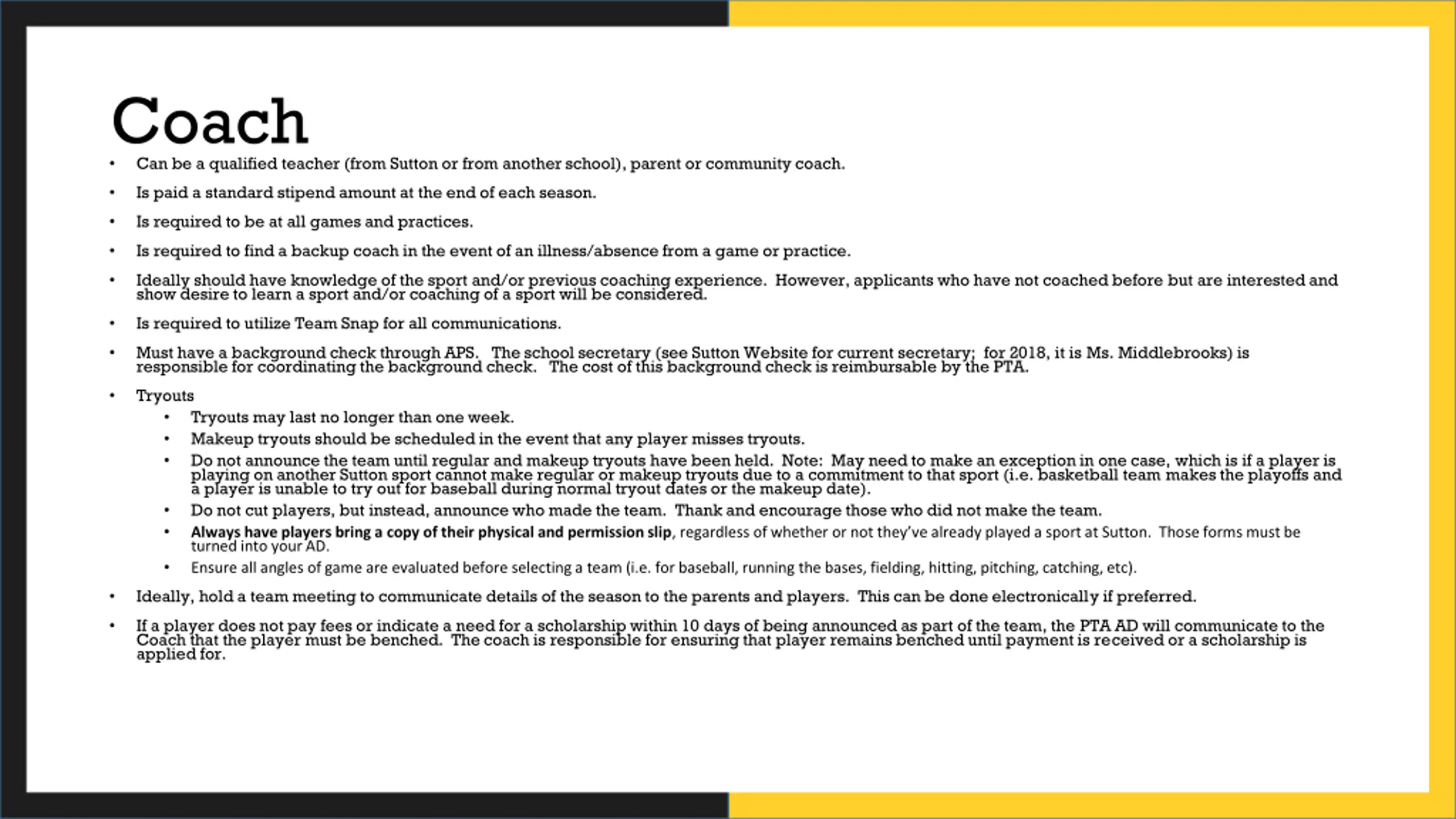 Coach Can be a qualified teacher (from Sutton or from another school), parent or community coach. Is paid a standard stipend amount at the end of each season. Is required to be at all games and practices. Is required to find a backup coach in the event of an illness/absence from a game or practice. Ideally should have knowledge of the sport and/or previous coaching experience. However, applicants who have not coached before but are interested and show desire to learn a sport and/or coaching of a sport will be considered. Is required to utilize Team Snap for all communications. Must have a background check through APS. The school secretary (see Sutton Website for current secretary; for 2018, it is Ms. Middlebrooks) is responsible for coordinating the background check. The cost of this background check is reimbursable by the PTA. Tryouts Tryouts may last no longer than one week. Makeup tryouts should be scheduled in the event that any player misses tryouts. Do not announce the team until regular and makeup tryouts have been held. Note: May need to make an exception in one case, which is if a player is playing on another Sutton sport cannot make regular or makeup tryouts due to a commitment to that sport (i.e. basketball team makes the playoffs and a player is unable to try out for baseball during normal tryout dates or the makeup date). Do not cut players, but instead, announce who made the team. Thank and encourage those who did not make the team. Always have players bring a copy of their physical and permission slip, regardless of whether or not they ve already played a sport at Sutton. Those forms must be turned into your AD. Ensure all angles of game are evaluated before selecting a team (i.e. for baseball, running the bases, fielding, hitting, pitching, catching, etc). Ideally, hold a team meeting to communicate details of the season to the parents and players. This can be done electronically if preferred. If a player does not pay fees or indicate a need for a scholarship within 10 days of being announced as part of the team, the PTA AD will communicate to the Coach that the player must be benched. The coach is responsible for ensuring that player remains benched until payment is received or a scholarship is applied for.