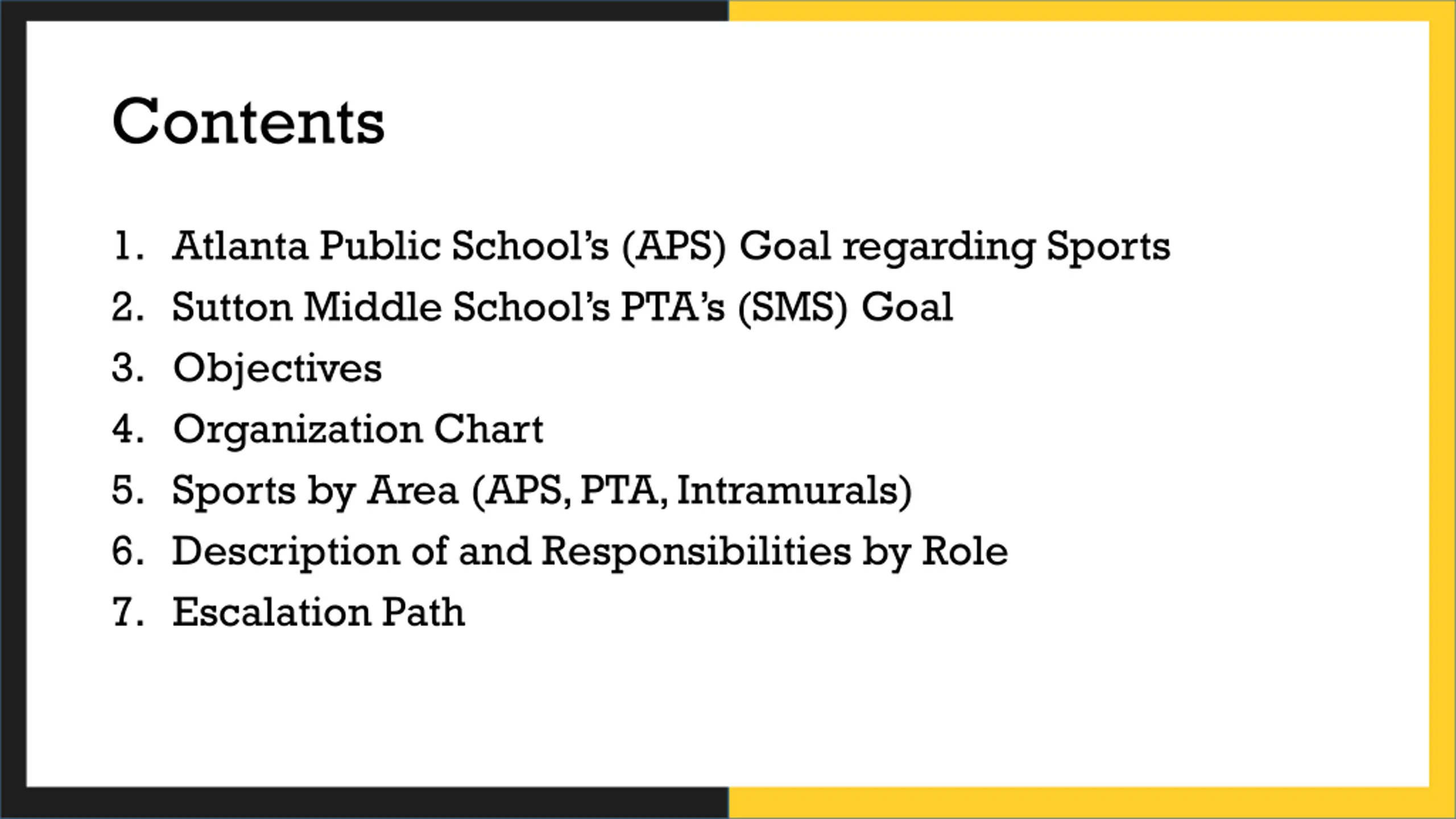 Contents 1. Atlanta Public School s (APS) Goal regarding Sports 2. Sutton Middle School s PTA s (SMS) Goal 3. Objectives 4. Organization Chart 5. Sports by Area (APS, PTA, Intramurals) 6. Description of and Responsibilities by Role 7. Escalation Path