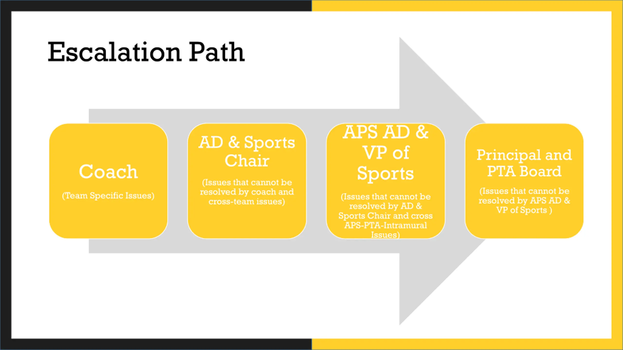 Escalation Path APS AD & VP of Sports AD & Sports Chair Principal and PTA Board Coach (Issues that cannot be resolved by coach and cross-team issues) (Issues that cannot be resolved by APS AD & VP of Sports ) (Team Specific Issues) (Issues that cannot be resolved by AD & Sports Chair and cross APS-PTA-Intramural Issues)