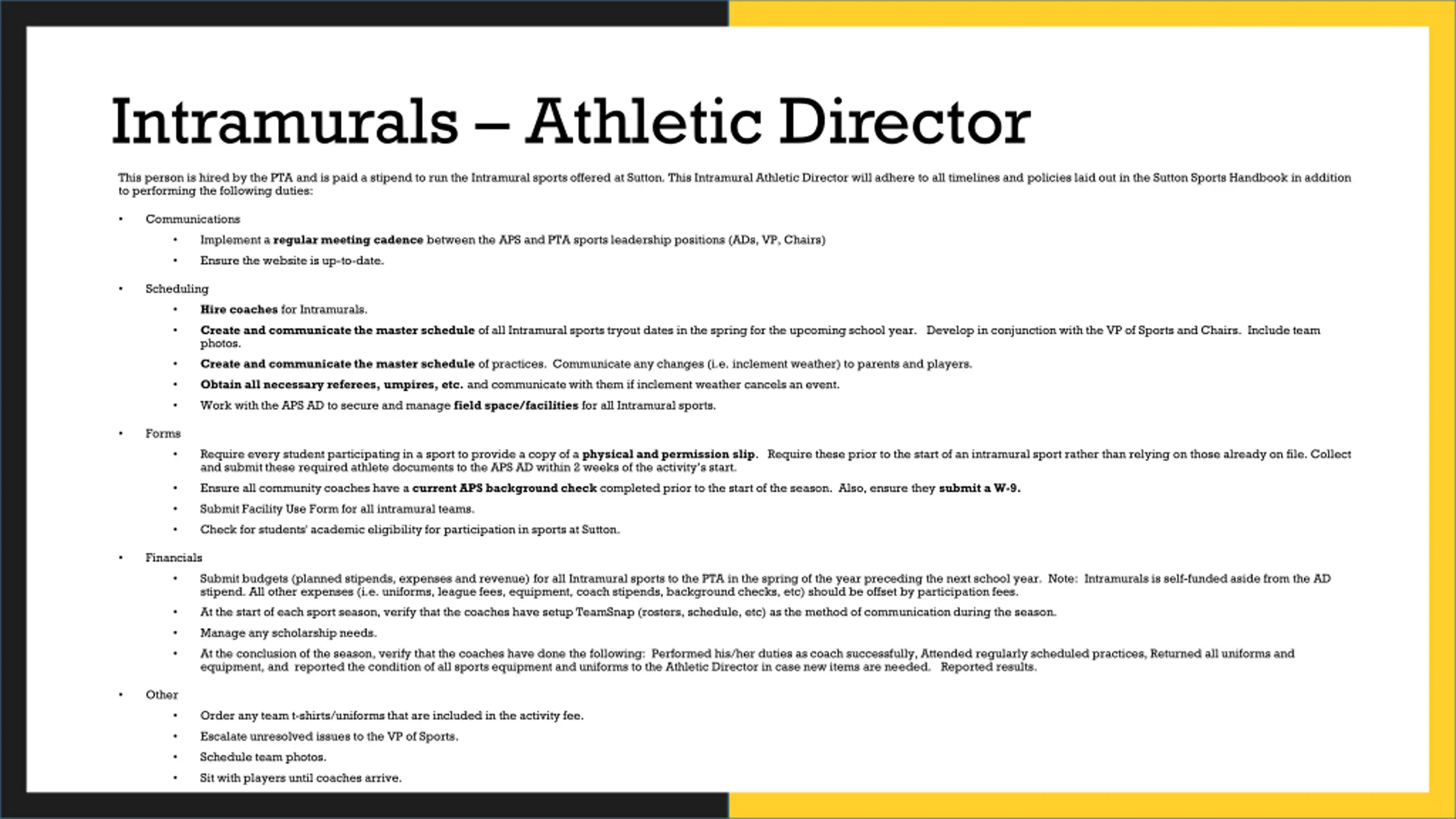 Intramurals Athletic Director This person is hired by the PTA and is paid a stipend to run the Intramural sports offered at Sutton. This Intramural Athletic Director will adhere to all timelines and policies laid out in the Sutton Sports Handbook in addition to performing the following duties: Communications Implement a regular meeting cadence between the APS and PTA sports leadership positions (ADs, VP, Chairs) Ensure the website is up-to-date. Scheduling Hire coaches for Intramurals. Create and communicate the master schedule of all Intramural sports tryout dates in the spring for the upcoming school year. Develop in conjunction with the VP of Sports and Chairs. Include team photos. Create and communicate the master schedule of practices. Communicate any changes (i.e. inclement weather) to parents and players. Obtain all necessary referees, umpires, etc. and communicate with them if inclement weather cancels an event. Work with the APS AD to secure and manage field space/facilities for all Intramural sports. Forms Require every student participating in a sport to provide a copy of a physical and permission slip. Require these prior to the start of an intramural sport rather than relying on those already on file. Collect and submit these required athlete documents to the APS AD within 2 weeks of the activity s start. Ensure all community coaches have a current APS background check completed prior to the start of the season. Also, ensure they submit a W-9. Submit Facility Use Form for all intramural teams. Check for students' academic eligibility for participation in sports at Sutton. Financials Submit budgets (planned stipends, expenses and revenue) for all Intramural sports to the PTA in the spring of the year preceding the next school year. Note: Intramurals is self-funded aside from the AD stipend. All other expenses (i.e. uniforms, league fees, equipment, coach stipends, background checks, etc) should be offset by participation fees. At the start of each sport season, verify that the coaches have setup TeamSnap (rosters, schedule, etc) as the method of communication during the season. Manage any scholarship needs. At the conclusion of the season, verify that the coaches have done the following: Performed his/her duties as coach successfully, Attended regularly scheduled practices, Returned all uniforms and equipment, and reported the condition of all sports equipment and uniforms to the Athletic Director in case new items are needed. Reported results. Other Order any team t-shirts/uniforms that are included in the activity fee. Escalate unresolved issues to the VP of Sports. Schedule team photos. Sit with players until coaches arrive.