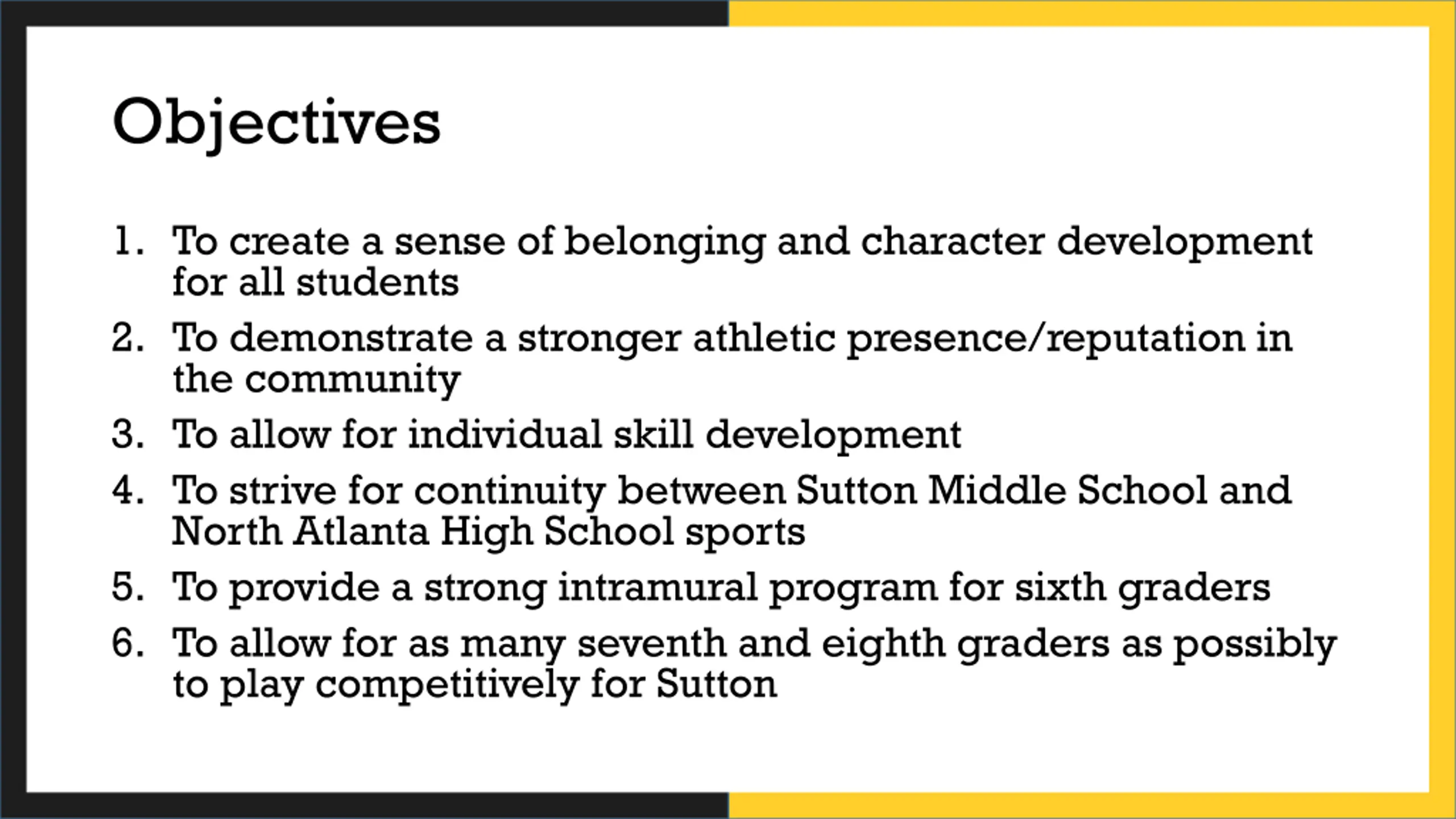 Objectives 1. To create a sense of belonging and character development for all students 2. To demonstrate a stronger athletic presence/reputation in the community 3. To allow for individual skill development 4. To strive for continuity between Sutton Middle School and North Atlanta High School sports 5. To provide a strong intramural program for sixth graders 6. To allow for as many seventh and eighth graders as possibly to play competitively for Sutton