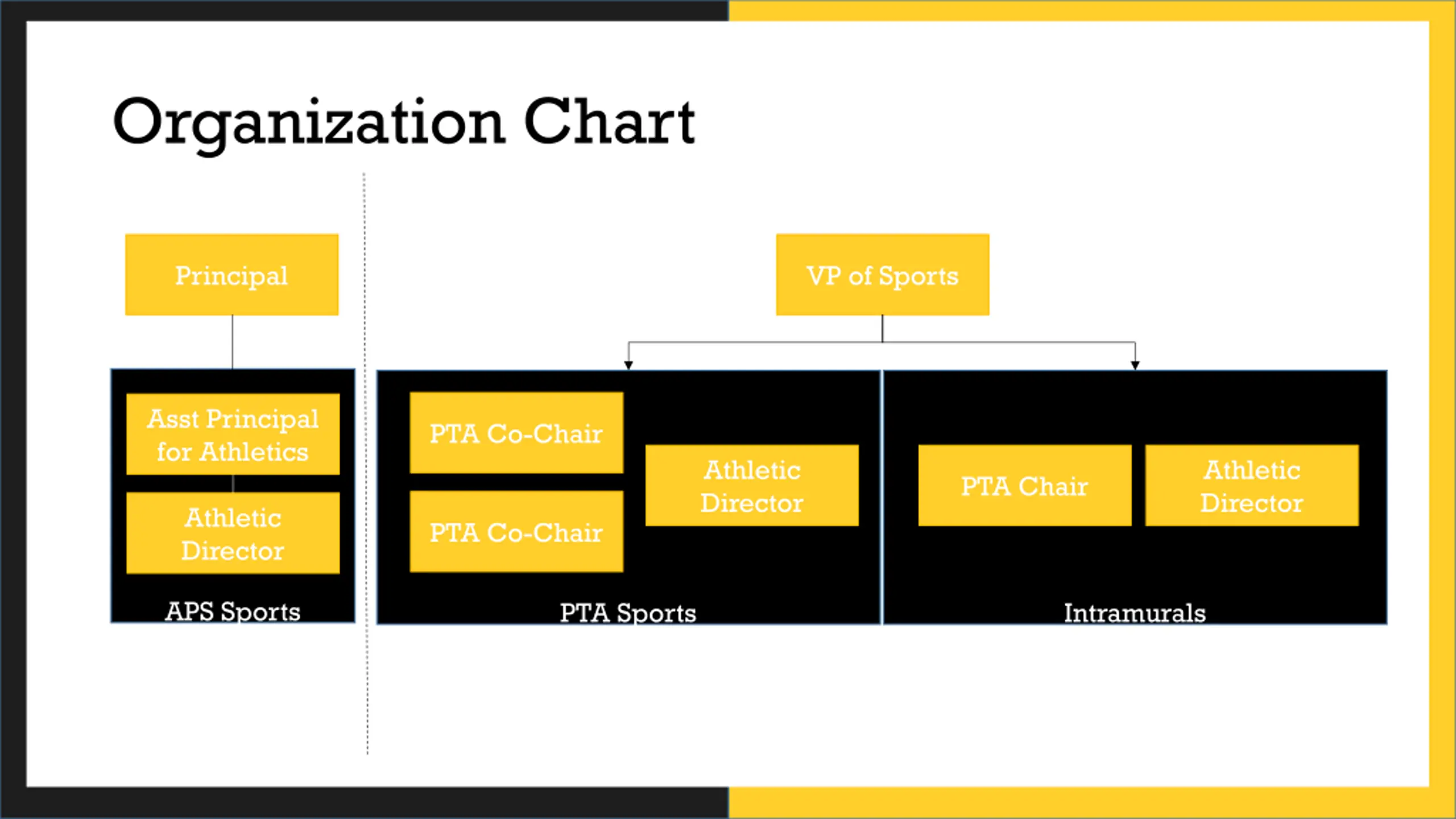 Organization Chart Principal VP of Sports Asst Principal for Athletics PTA Co-Chair Athletic Director Athletic Director PTA Chair Athletic Director PTA Co-Chair APS Sports PTA Sports Intramurals