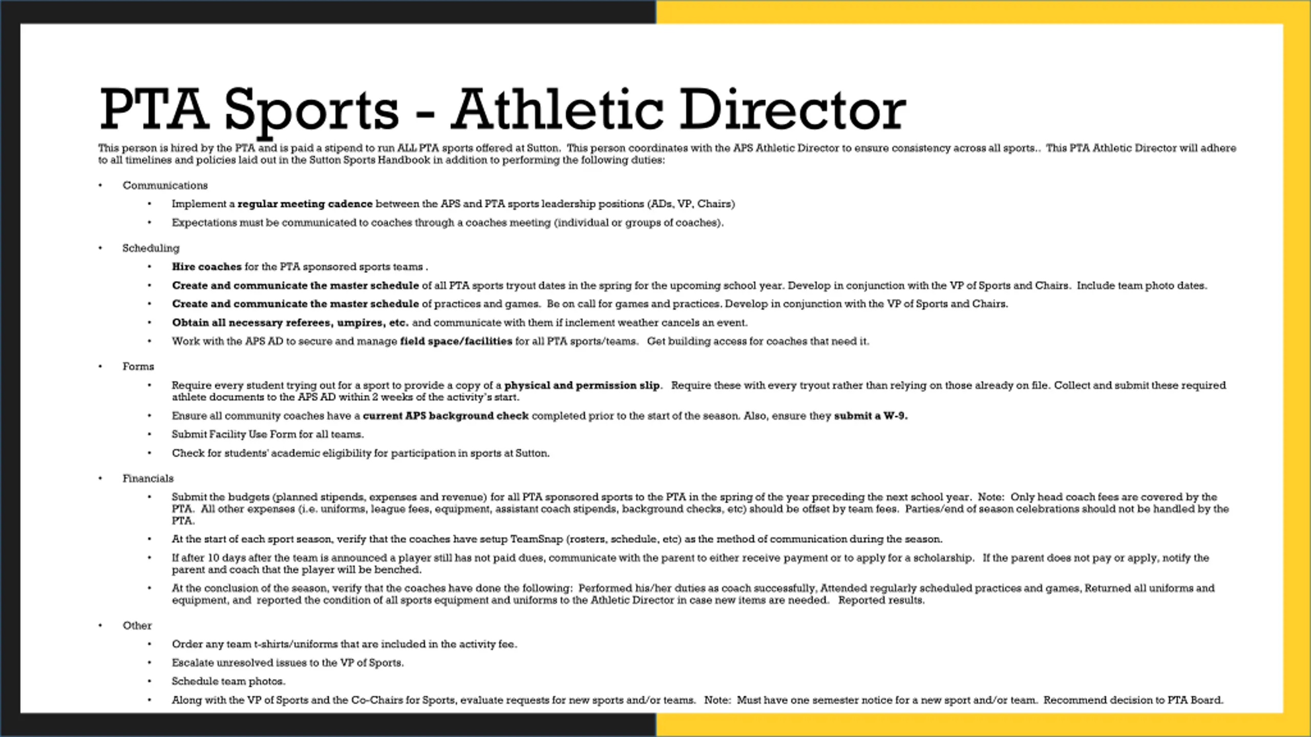 PTA Sports - Athletic Director This person is hired by the PTA and is paid a stipend to run ALL PTA sports offered at Sutton. This person coordinates with the APS Athletic Director to ensure consistency across all sports.. This PTA Athletic Director will adhere to all timelines and policies laid out in the Sutton Sports Handbook in addition to performing the following duties: Communications Implement a regular meeting cadence between the APS and PTA sports leadership positions (ADs, VP, Chairs) Expectations must be communicated to coaches through a coaches meeting (individual or groups of coaches). Scheduling Hire coaches for the PTA sponsored sports teams . Create and communicate the master schedule of all PTA sports tryout dates in the spring for the upcoming school year. Develop in conjunction with the VP of Sports and Chairs. Include team photo dates. Create and communicate the master schedule of practices and games. Be on call for games and practices. Develop in conjunction with the VP of Sports and Chairs. Obtain all necessary referees, umpires, etc. and communicate with them if inclement weather cancels an event. Work with the APS AD to secure and manage field space/facilities for all PTA sports/teams. Get building access for coaches that need it. Forms Require every student trying out for a sport to provide a copy of a physical and permission slip. Require these with every tryout rather than relying on those already on file. Collect and submit these required athlete documents to the APS AD within 2 weeks of the activity s start. Ensure all community coaches have a current APS background check completed prior to the start of the season. Also, ensure they submit a W-9. Submit Facility Use Form for all teams. Check for students' academic eligibility for participation in sports at Sutton. Financials Submit the budgets (planned stipends, expenses and revenue) for all PTA sponsored sports to the PTA in the spring of the year preceding the next school year. Note: Only head coach fees are covered by the PTA. All other expenses (i.e. uniforms, league fees, equipment, assistant coach stipends, background checks, etc) should be offset by team fees. Parties/end of season celebrations should not be handled by the PTA. At the start of each sport season, verify that the coaches have setup TeamSnap (rosters, schedule, etc) as the method of communication during the season. If after 10 days after the team is announced a player still has not paid dues, communicate with the parent to either receive payment or to apply for a scholarship. If the parent does not pay or apply, notify the parent and coach that the player will be benched. At the conclusion of the season, verify that the coaches have done the following: Performed his/her duties as coach successfully, Attended regularly scheduled practices and games, Returned all uniforms and equipment, and reported the condition of all sports equipment and uniforms to the Athletic Director in case new items are needed. Reported results. Other Order any team t-shirts/uniforms that are included in the activity fee. Escalate unresolved issues to the VP of Sports. Schedule team photos. Along with the VP of Sports and the Co-Chairs for Sports, evaluate requests for new sports and/or teams. Note: Must have one semester notice for a new sport and/or team. Recommend decision to PTA Board.