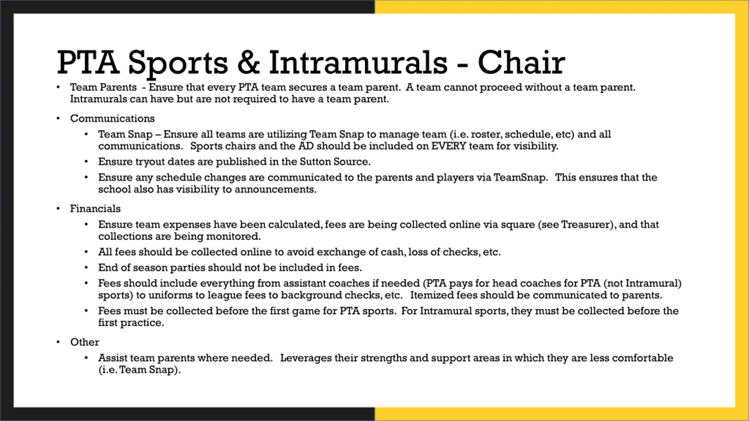 PTA Sports & Intramurals - Chair Team Parents - Ensure that every PTA team secures a team parent. A team cannot proceed without a team parent. Intramurals can have but are not required to have a team parent. Communications Team Snap Ensure all teams are utilizing Team Snap to manage team (i.e. roster, schedule, etc) and all communications. Sports chairs and the AD should be included on EVERY team for visibility. Ensure tryout dates are published in the Sutton Source. Ensure any schedule changes are communicated to the parents and players via TeamSnap. This ensures that the school also has visibility to announcements. Financials Ensure team expenses have been calculated, fees are being collected online via square (see Treasurer), and that collections are being monitored. All fees should be collected online to avoid exchange of cash, loss of checks, etc. End of season parties should not be included in fees. Fees should include everything from assistant coaches if needed (PTA pays for head coaches for PTA (not Intramural) sports) to uniforms to league fees to background checks, etc. Itemized fees should be communicated to parents. Fees must be collected before the first game for PTA sports. For Intramural sports, they must be collected before the first practice. Other Assist team parents where needed. Leverages their strengths and support areas in which they are less comfortable (i.e. Team Snap).