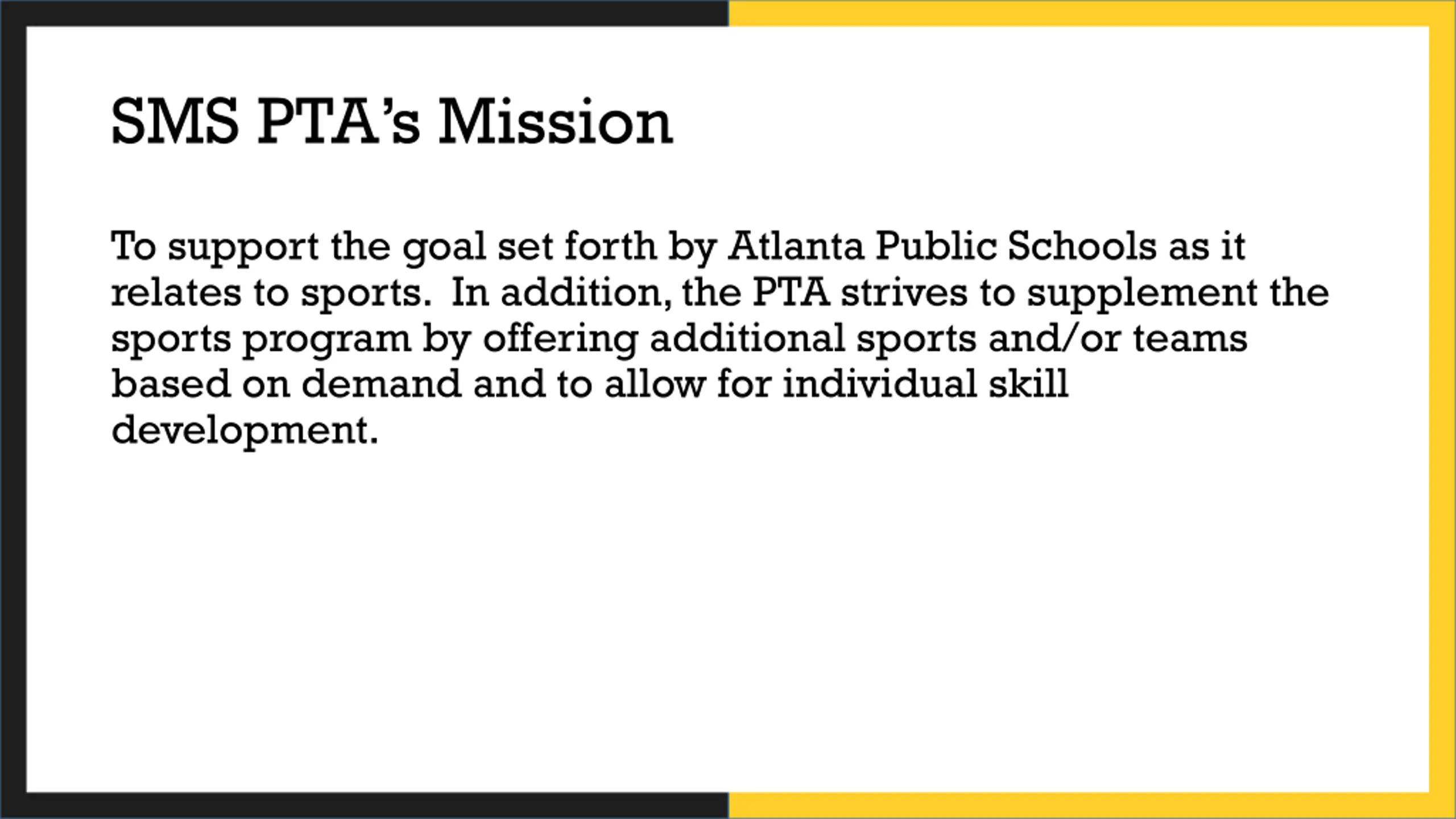 SMS PTAs Mission To support the goal set forth by Atlanta Public Schools as it relates to sports. In addition, the PTA strives to supplement the sports program by offering additional sports and/or teams based on demand and to allow for individual skill development.