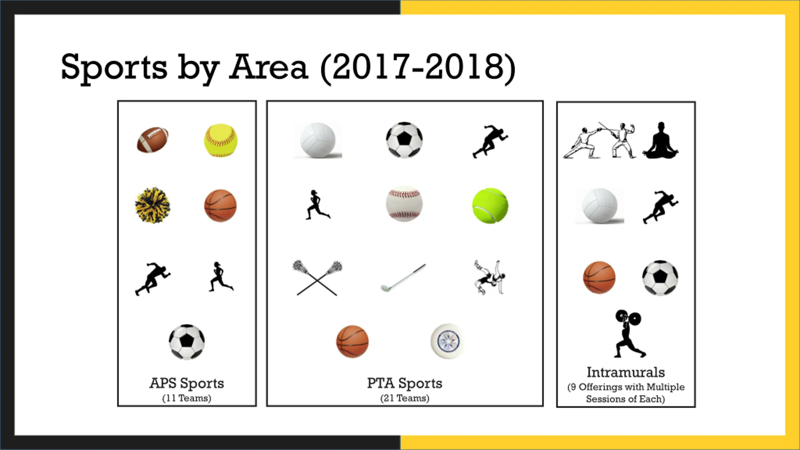 Sports by Area (2017-2018) Intramurals (9 Offerings with Multiple Sessions of Each) APS Sports (11 Teams) PTA Sports (21 Teams)
