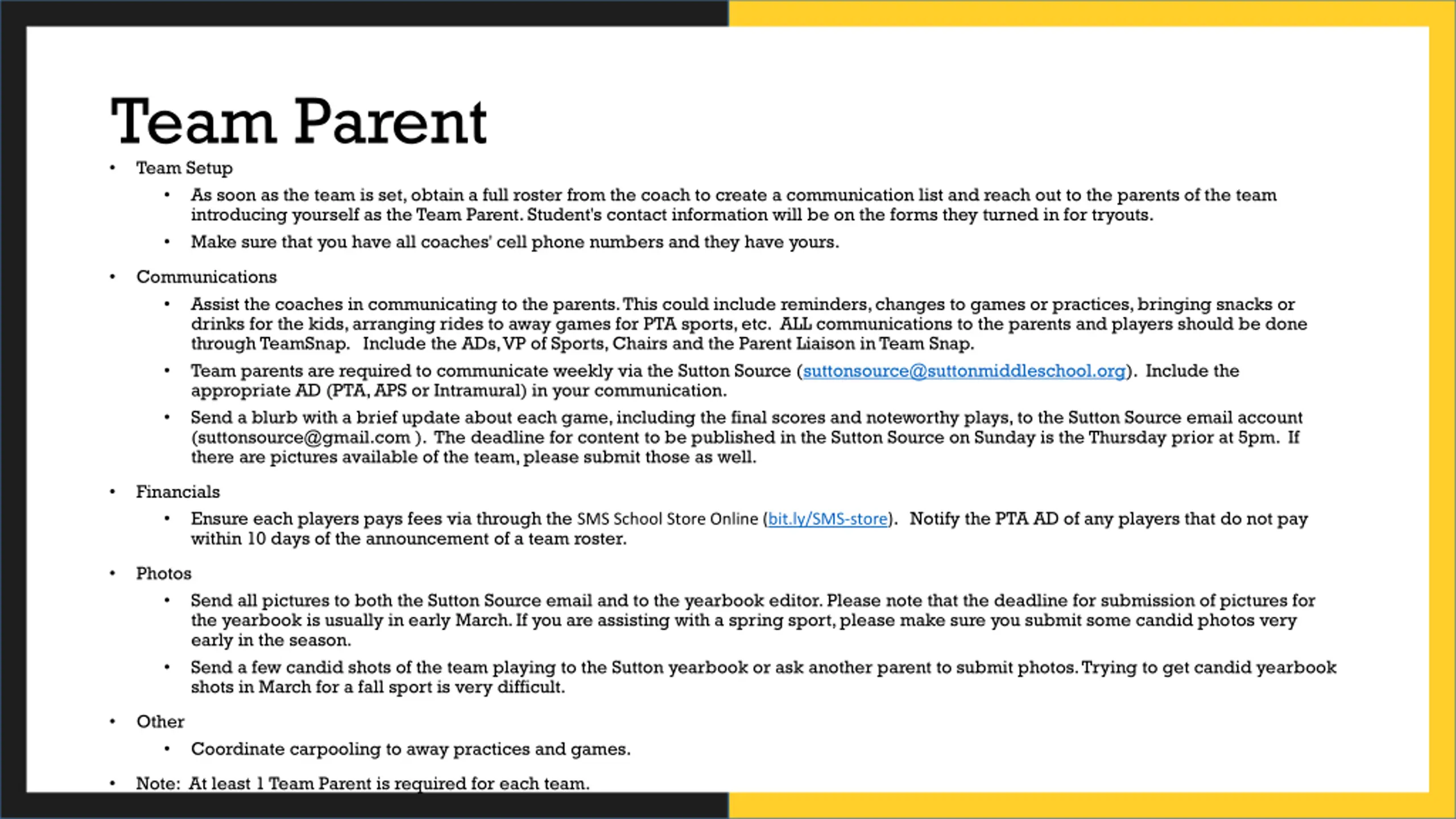 Team Parent Team Setup As soon as the team is set, obtain a full roster from the coach to create a communication list and reach out to the parents of the team introducing yourself as the Team Parent. Student's contact information will be on the forms they turned in for tryouts. Make sure that you have all coaches' cell phone numbers and they have yours. Communications Assist the coaches in communicating to the parents. This could include reminders, changes to games or practices, bringing snacks or drinks for the kids, arranging rides to away games for PTA sports, etc. ALL communications to the parents and players should be done through TeamSnap. Include the ADs, VP of Sports, Chairs and the Parent Liaison in Team Snap. Team parents are required to communicate weekly via the Sutton Source (suttonsource@suttonmiddleschool.org). Include the appropriate AD (PTA, APS or Intramural) in your communication. Send a blurb with a brief update about each game, including the final scores and noteworthy plays, to the Sutton Source email account (suttonsource@gmail.com ). The deadline for content to be published in the Sutton Source on Sunday is the Thursday prior at 5pm. If there are pictures available of the team, please submit those as well. Financials Ensure each players pays fees via through the SMS School Store Online (bit.ly/SMS-store). Notify the PTA AD of any players that do not pay within 10 days of the announcement of a team roster. Photos Send all pictures to both the Sutton Source email and to the yearbook editor. Please note that the deadline for submission of pictures for the yearbook is usually in early March. If you are assisting with a spring sport, please make sure you submit some candid photos very early in the season. Send a few candid shots of the team playing to the Sutton yearbook or ask another parent to submit photos. Trying to get candid yearbook shots in March for a fall sport is very difficult. Other Coordinate carpooling to away practices and games. Note: At least 1 Team Parent is required for each team.