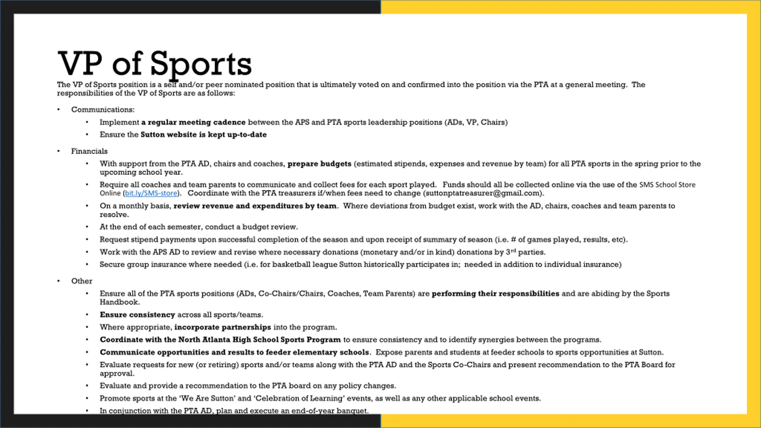 VP of Sports The VP of Sports position is a self and/or peer nominated position that is ultimately voted on and confirmed into the position via the PTA at a general meeting. The responsibilities of the VP of Sports are as follows: Communications: Implement a regular meeting cadence between the APS and PTA sports leadership positions (ADs, VP, Chairs) Ensure the Sutton website is kept up-to-date Financials With support from the PTA AD, chairs and coaches, prepare budgets (estimated stipends, expenses and revenue by team) for all PTA sports in the spring prior to the upcoming school year. Require all coaches and team parents to communicate and collect fees for each sport played. Funds should all be collected online via the use of the SMS School Store Online (bit.ly/SMS-store). Coordinate with the PTA treasurers if/when fees need to change (suttonptatreasurer@gmail.com). On a monthly basis, review revenue and expenditures by team. Where deviations from budget exist, work with the AD, chairs, coaches and team parents to resolve. At the end of each semester, conduct a budget review. Request stipend payments upon successful completion of the season and upon receipt of summary of season (i.e. # of games played, results, etc). Work with the APS AD to review and revise where necessary donations (monetary and/or in kind) donations by 3rd parties. Secure group insurance where needed (i.e. for basketball league Sutton historically participates in; needed in addition to individual insurance) Other Ensure all of the PTA sports positions (ADs, Co-Chairs/Chairs, Coaches, Team Parents) are performing their responsibilities and are abiding by the Sports Handbook. Ensure consistency across all sports/teams. Where appropriate, incorporate partnerships into the program. Coordinate with the North Atlanta High School Sports Program to ensure consistency and to identify synergies between the programs. Communicate opportunities and results to feeder elementary schools. Expose parents and students at feeder schools to sports opportunities at Sutton. Evaluate requests for new (or retiring) sports and/or teams along with the PTA AD and the Sports Co-Chairs and present recommendation to the PTA Board for approval. Evaluate and provide a recommendation to the PTA board on any policy changes. Promote sports at the We Are Sutton and Celebration of Learning events, as well as any other applicable school events. In conjunction with the PTA AD, plan and execute an end-of-year banquet.