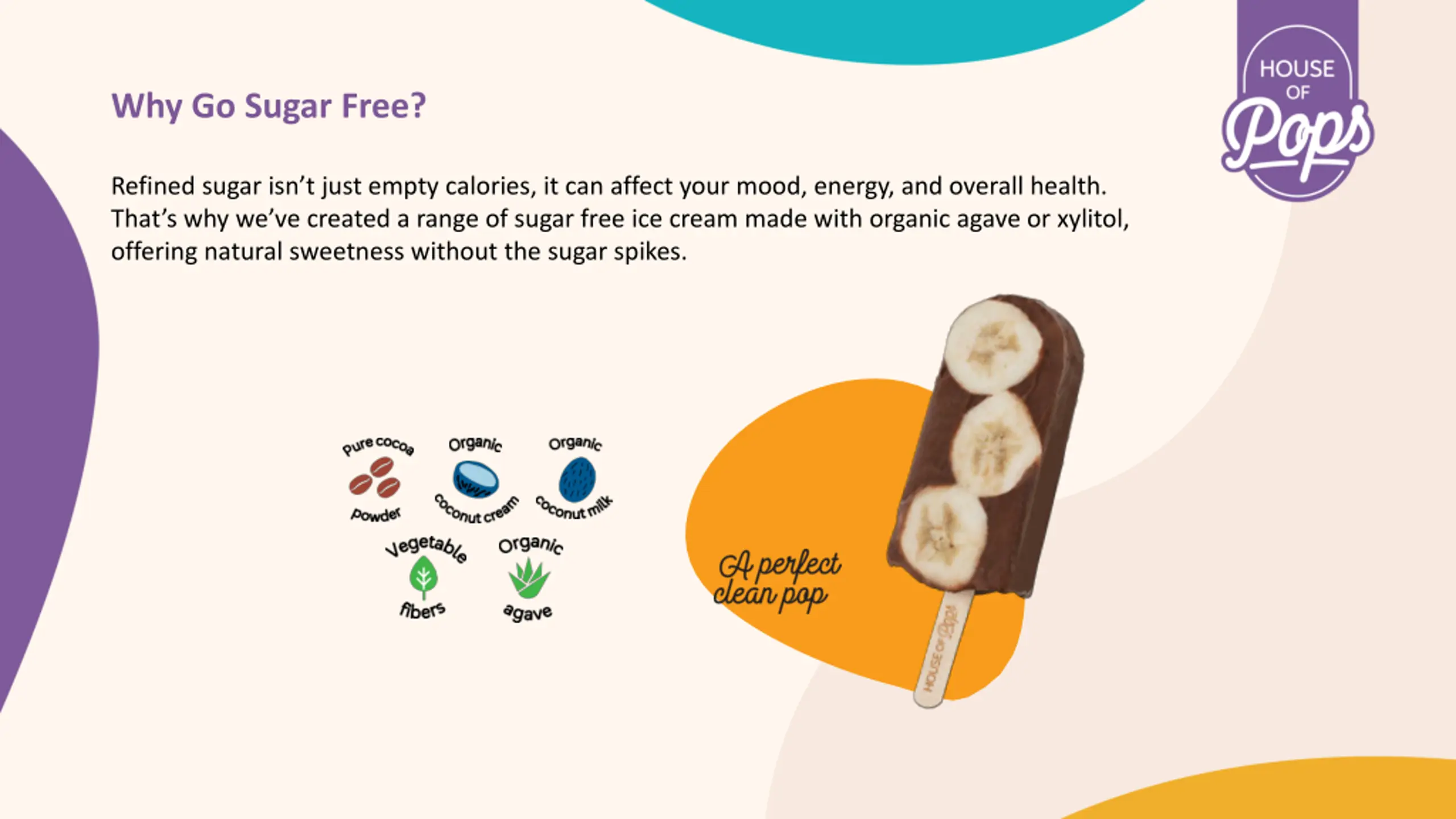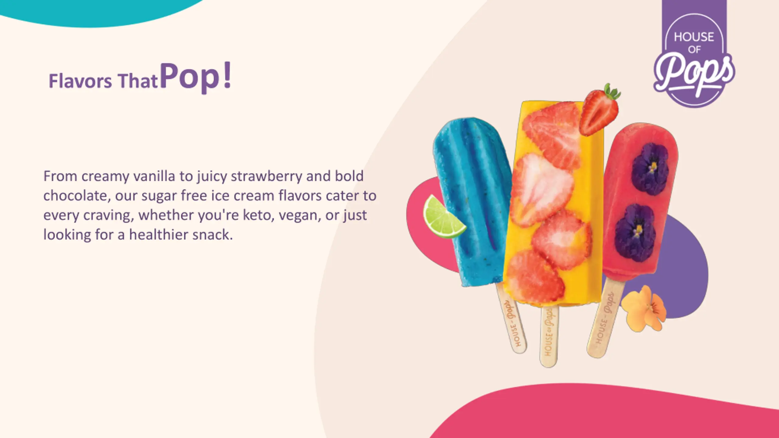 Introducing House of Popsu2019 delicious and healthy sugar free ice cream. Highlighting the benefits of going sugar-free, our clean ingredients promise, and how our pops deliver guilt-free joy. Ideal for health-conscious snackers seeking all-natural