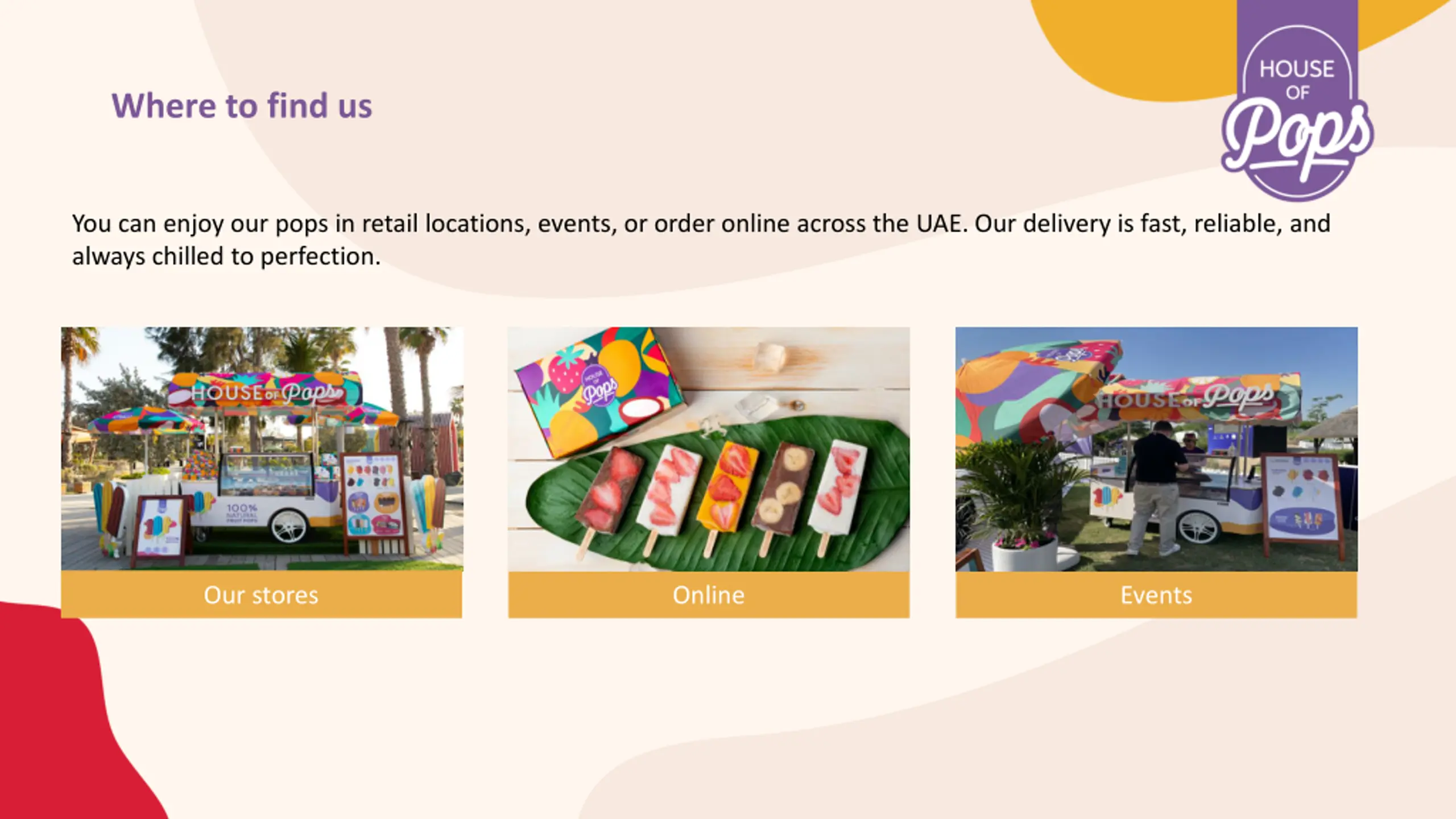 Where to find us You can enjoy our pops in retail locations, events, or order online across the UAE. Our delivery is fast, reliable, and always chilled to perfection. Our stores Online Events