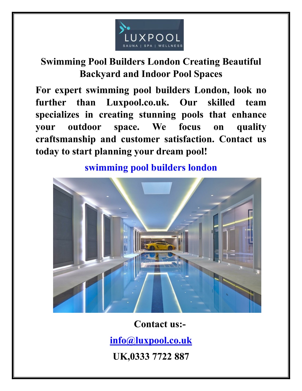 Swimming Pool Builders London Creating Beautiful Backyard and Indoor Pool Spaces For expert swimming pool builders London, look no further than Luxpool.co.uk. specializes in creating stunning pools that enhance your outdoor space. craftsmanship and customer satisfaction. Contact us today to start planning your dream pool! Our skilled team We focus on quality swimming pool builders london Contact us:- info@luxpool.co.uk UK,0333 7722 887