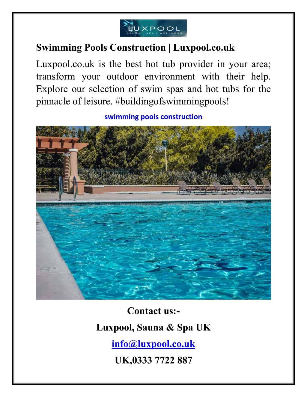 Swimming Pools Construction | Luxpool.co.uk Luxpool.co.uk is the best hot tub provider in your area; transform your outdoor environment with their help. Explore our selection of swim spas and hot tubs for the pinnacle of leisure. #buildingofswimmingpools! swimming pools construction Contact us:- Luxpool, Sauna & Spa UK info@luxpool.co.uk UK,0333 7722 887