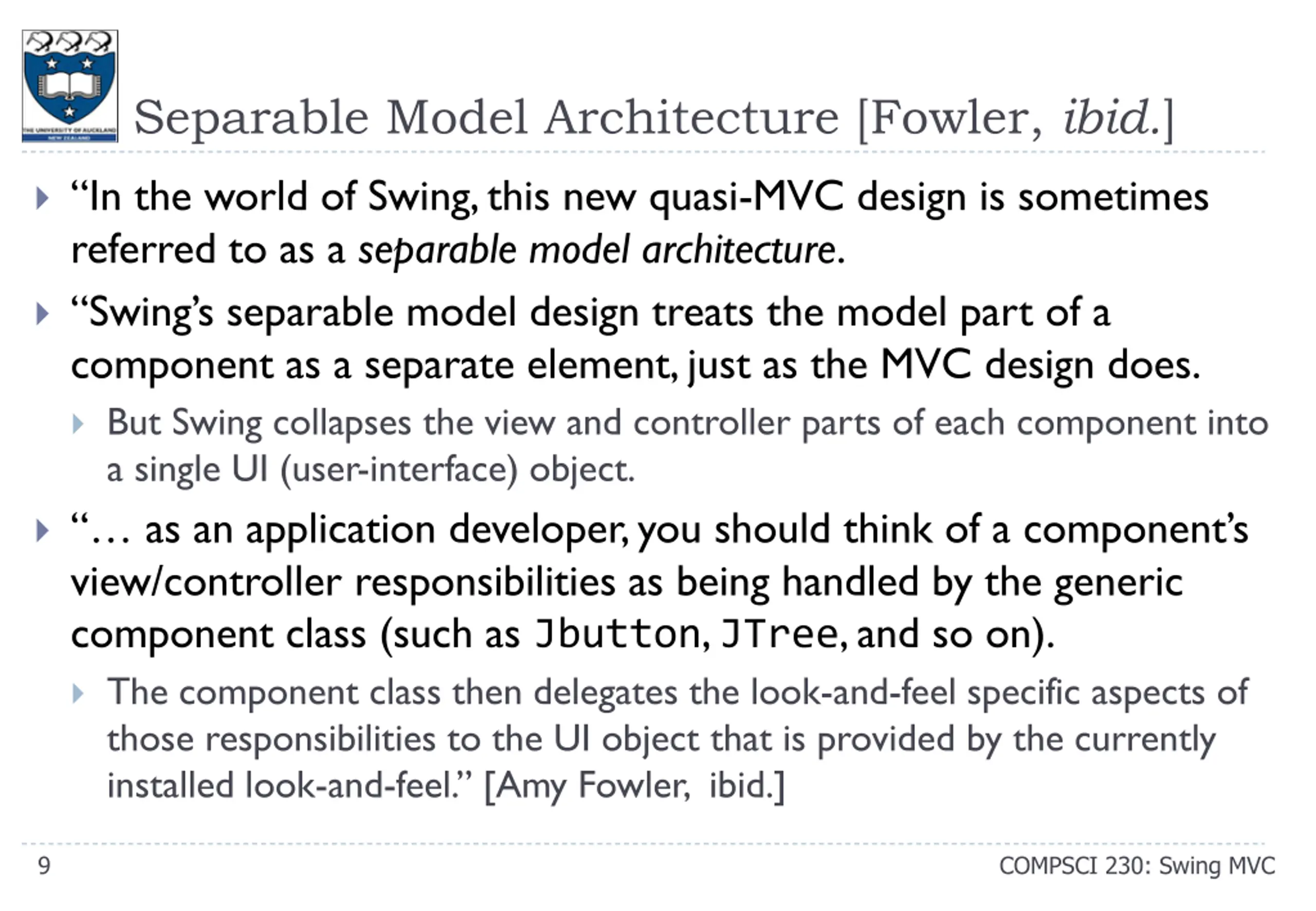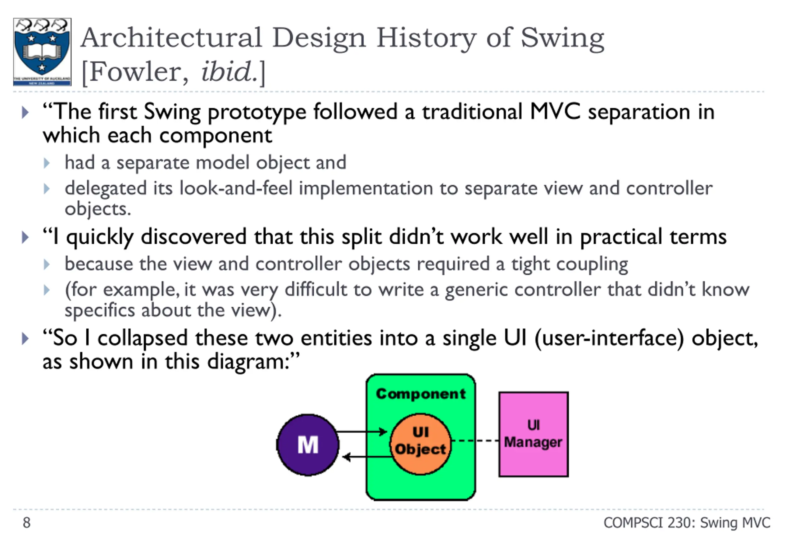 Architectural Design History of Swing [Fowler, ibid.] The first Swing prototype followed a traditional MVC separation in which each component had a separate model object and delegated its look-and-feel implementation to separate view and controller objects. I quickly discovered that this split didn t work well in practical terms because the view and controller objects required a tight coupling (for example, it was very difficult to write a generic controller that didn t know specifics about the view). So I collapsed these two entities into a single UI (user-interface) object, as shown in this diagram: 8 COMPSCI 230: Swing MVC