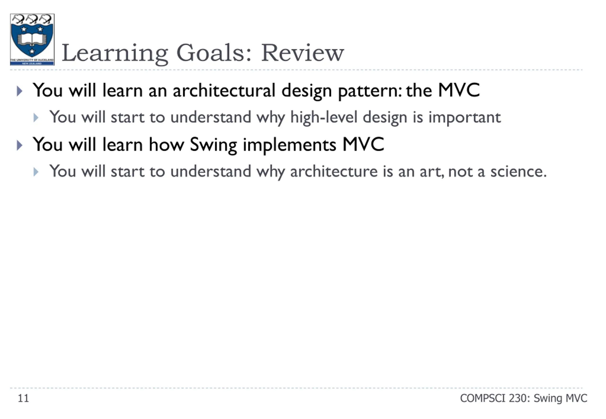 Learning Goals: Review You will learn an architectural design pattern: the MVC You will start to understand why high-level design is important You will learn how Swing implements MVC You will start to understand why architecture is an art, not a science. 11 COMPSCI 230: Swing MVC