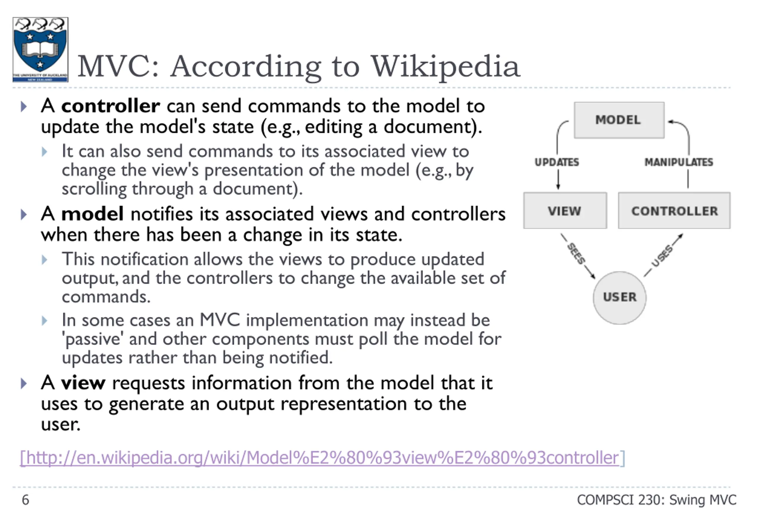 MVC: According to Wikipedia A controller can send commands to the model to update the model's state (e.g., editing a document). It can also send commands to its associated view to change the view's presentation of the model (e.g., by scrolling through a document). A model notifies its associated views and controllers when there has been a change in its state. This notification allows the views to produce updated output, and the controllers to change the available set of commands. In some cases an MVC implementation may instead be 'passive' and other components must poll the model for updates rather than being notified. A view requests information from the model that it uses to generate an output representation to the user. [http://en.wikipedia.org/wiki/Model%E2%80%93view%E2%80%93controller] 6 COMPSCI 230: Swing MVC