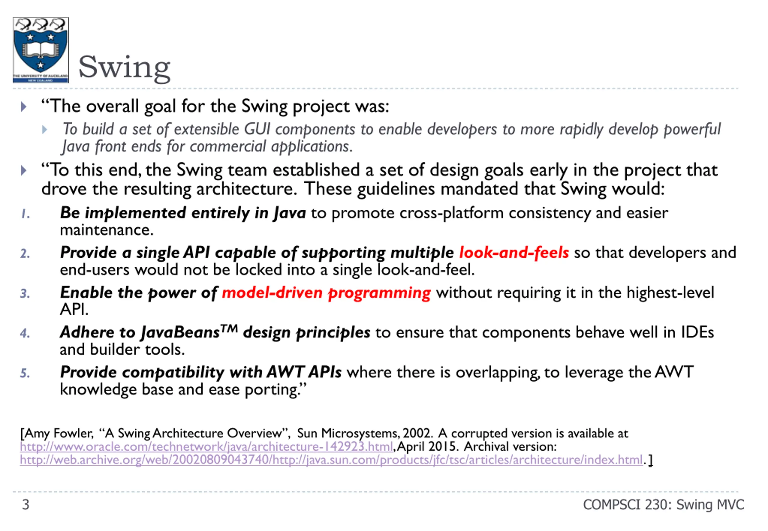 Swing The overall goal for the Swing project was: To build a set of extensible GUI components to enable developers to more rapidly develop powerful Java front ends for commercial applications. To this end, the Swing team established a set of design goals early in the project that drove the resulting architecture. These guidelines mandated that Swing would: 1. Be implemented entirely in Java to promote cross-platform consistency and easier maintenance. 2. Provide a single API capable of supporting multiple look-and-feels so that developers and end-users would not be locked into a single look-and-feel. 3. Enable the power of model-driven programming without requiring it in the highest-level API. 4. Adhere to JavaBeansTM design principles to ensure that components behave well in IDEs and builder tools. 5. Provide compatibility with AWT APIs where there is overlapping, to leverage the AWT knowledge base and ease porting. [Amy Fowler, A Swing Architecture Overview , Sun Microsystems, 2002. A corrupted version is available at http://www.oracle.com/technetwork/java/architecture-142923.html, April 2015. Archival version: http://web.archive.org/web/20020809043740/http://java.sun.com/products/jfc/tsc/articles/architecture/index.html. ] 3 COMPSCI 230: Swing MVC