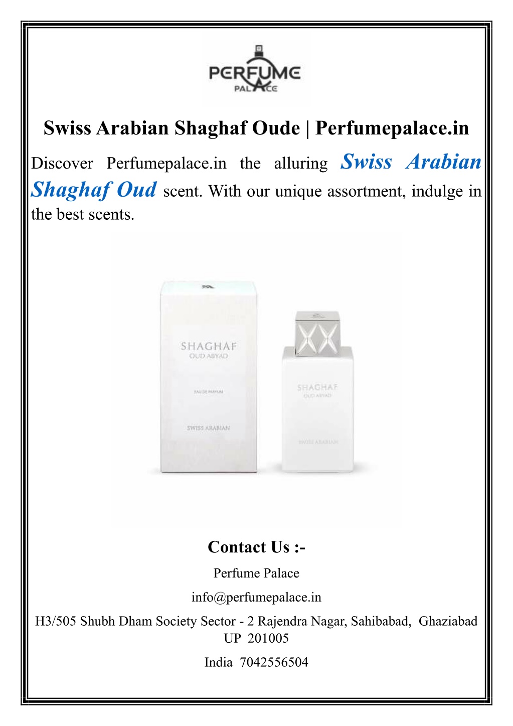 Swiss Arabian Shaghaf Oude | Perfumepalace.in Discover Perfumepalace.in the alluring Swiss Arabian Shaghaf Oudscent. With our unique assortment, indulge in the best scents. Contact Us :- Perfume Palace info@perfumepalace.in H3/505 Shubh Dham Society Sector - 2 Rajendra Nagar, Sahibabad, Ghaziabad UP 201005 India 7042556504