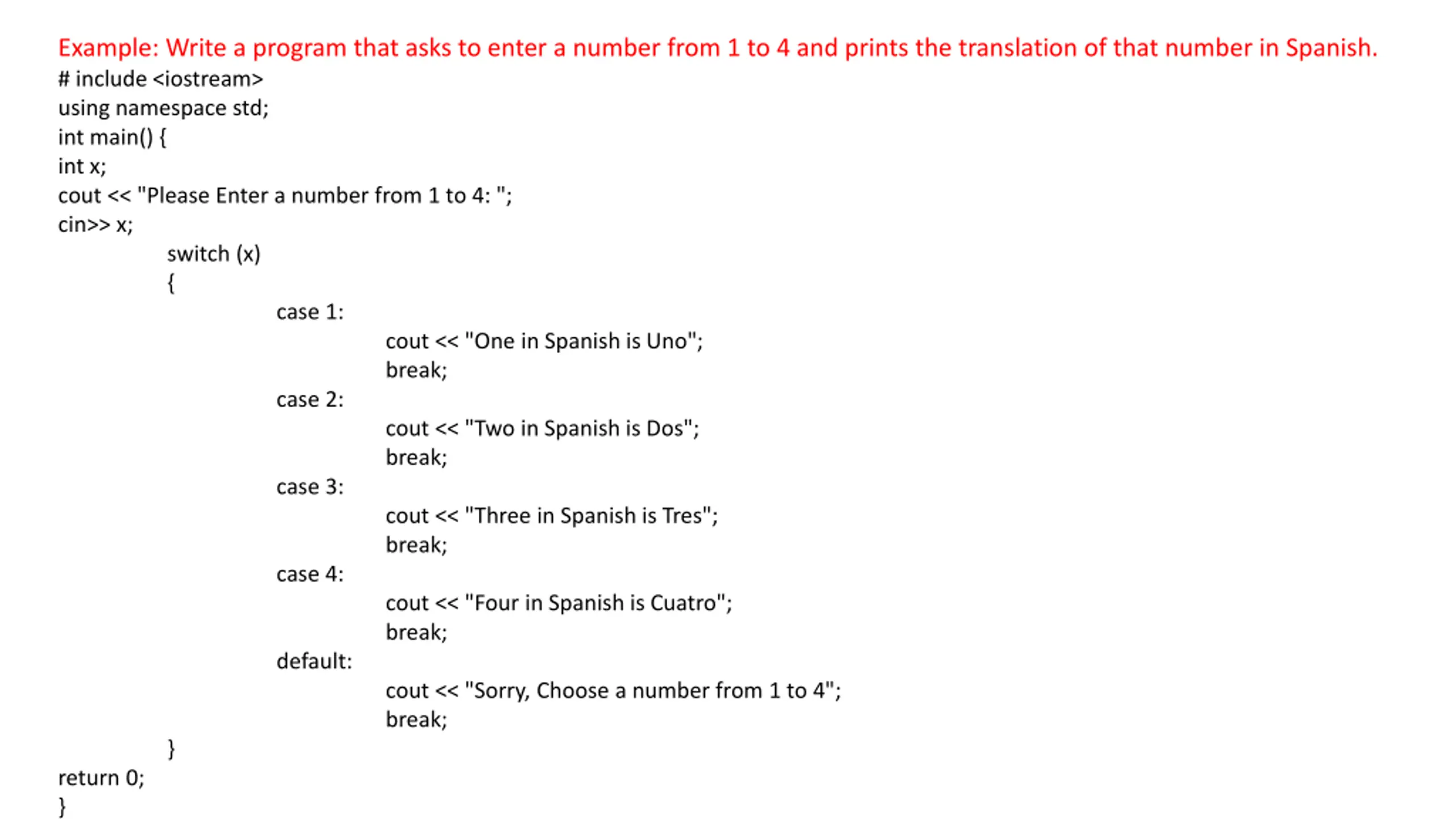Example: Write a program that asks to enter a number from 1 to 4 and prints the translation of that number in Spanish. # include <iostream> using namespace std; int main() { int x; cout << "Please Enter a number from 1 to 4: "; cin>> x; switch (x) { case 1: cout << "One in Spanish is Uno"; break; case 2: cout << "Two in Spanish is Dos"; break; case 3: cout << "Three in Spanish is Tres"; break; case 4: cout << "Four in Spanish is Cuatro"; break; default: cout << "Sorry, Choose a number from 1 to 4"; break; } return 0; }