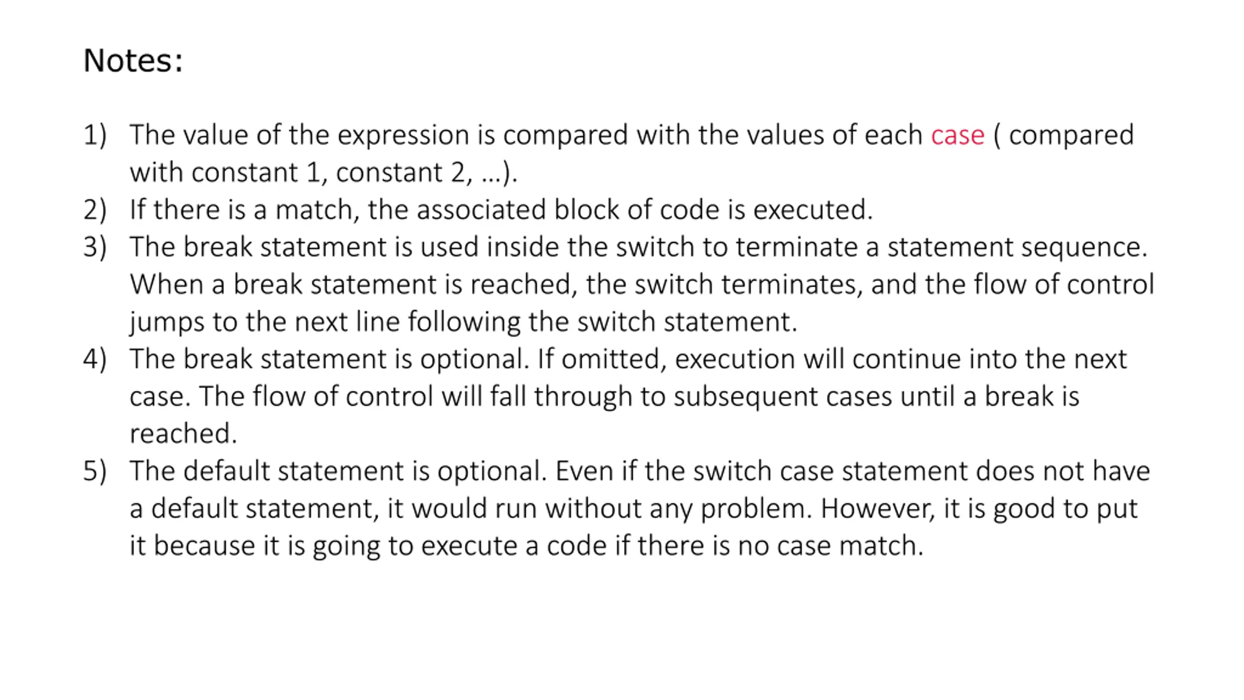 Notes: 1) The value of the expression is compared with the values of each case ( compared with constant 1, constant 2, ). 2) If there is a match, the associated block of code is executed. 3) The break statement is used inside the switch to terminate a statement sequence. When a break statement is reached, the switch terminates, and the flow of control jumps to the next line following the switch statement. 4) The break statement is optional. If omitted, execution will continue into the next case. The flow of control will fall through to subsequent cases until a break is reached. 5) The default statement is optional. Even if the switch case statement does not have a default statement, it would run without any problem. However, it is good to put it because it is going to execute a code if there is no case match.