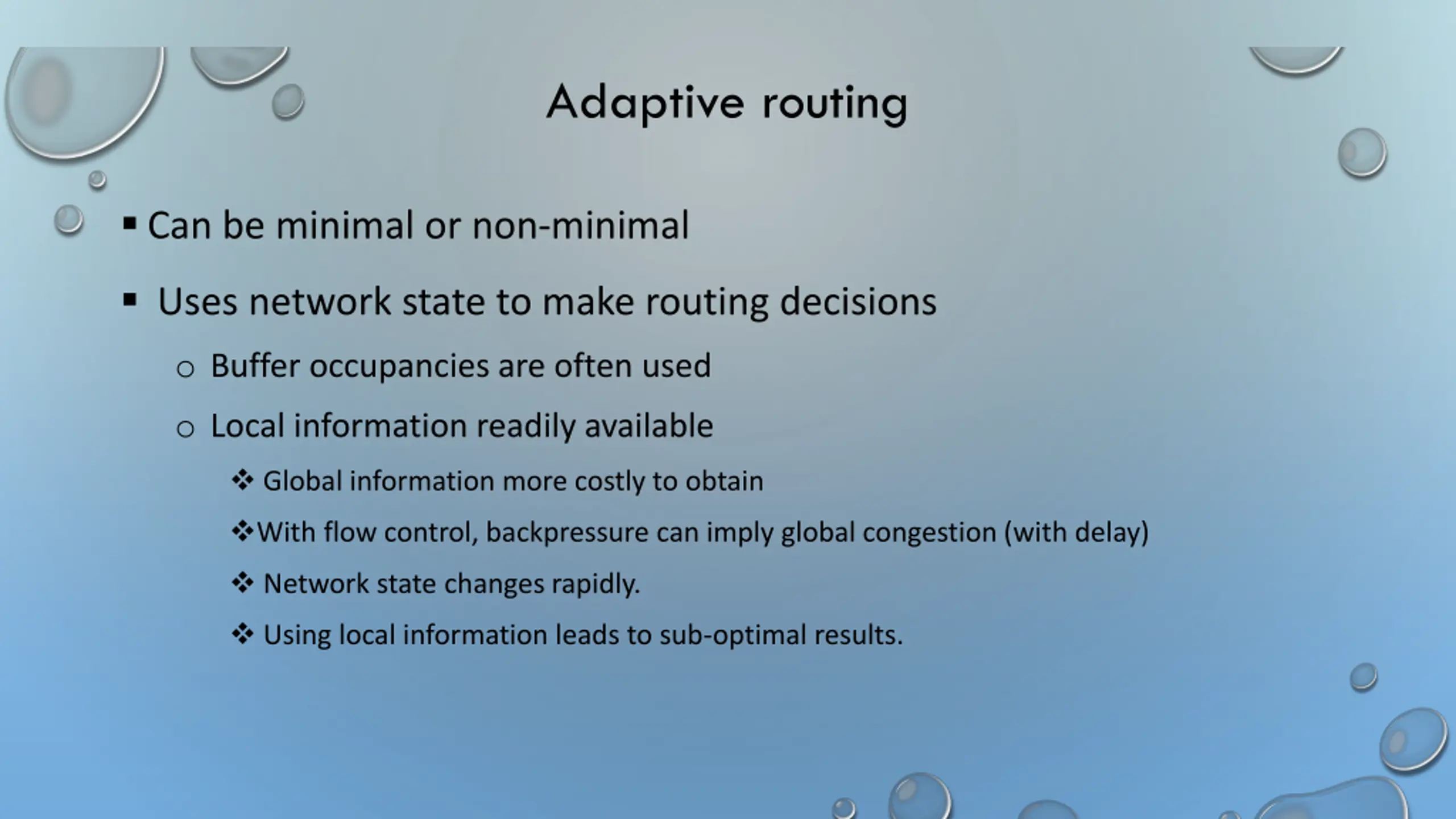 Adaptive routing Can be minimal or non-minimal Uses network state to make routing decisions o Buffer occupancies are often used o Local information readily available Global information more costly to obtain With flow control, backpressure can imply global congestion (with delay) Network state changes rapidly. Using local information leads to sub-optimal results.