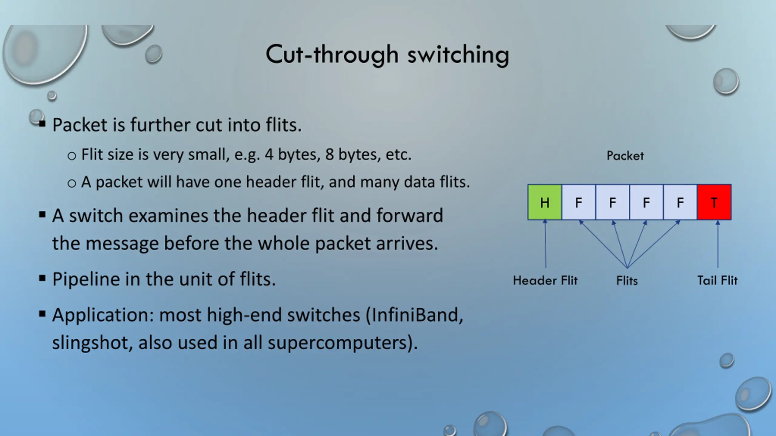 Cut-through switching Packet is further cut into flits. o Flit size is very small, e.g. 4 bytes, 8 bytes, etc. o A packet will have one header flit, and many data flits. A switch examines the header flit and forward the message before the whole packet arrives. Packet H F F F F T Pipeline in the unit of flits. Header Flit Tail Flit Flits Application: most high-end switches (InfiniBand, slingshot, also used in all supercomputers).
