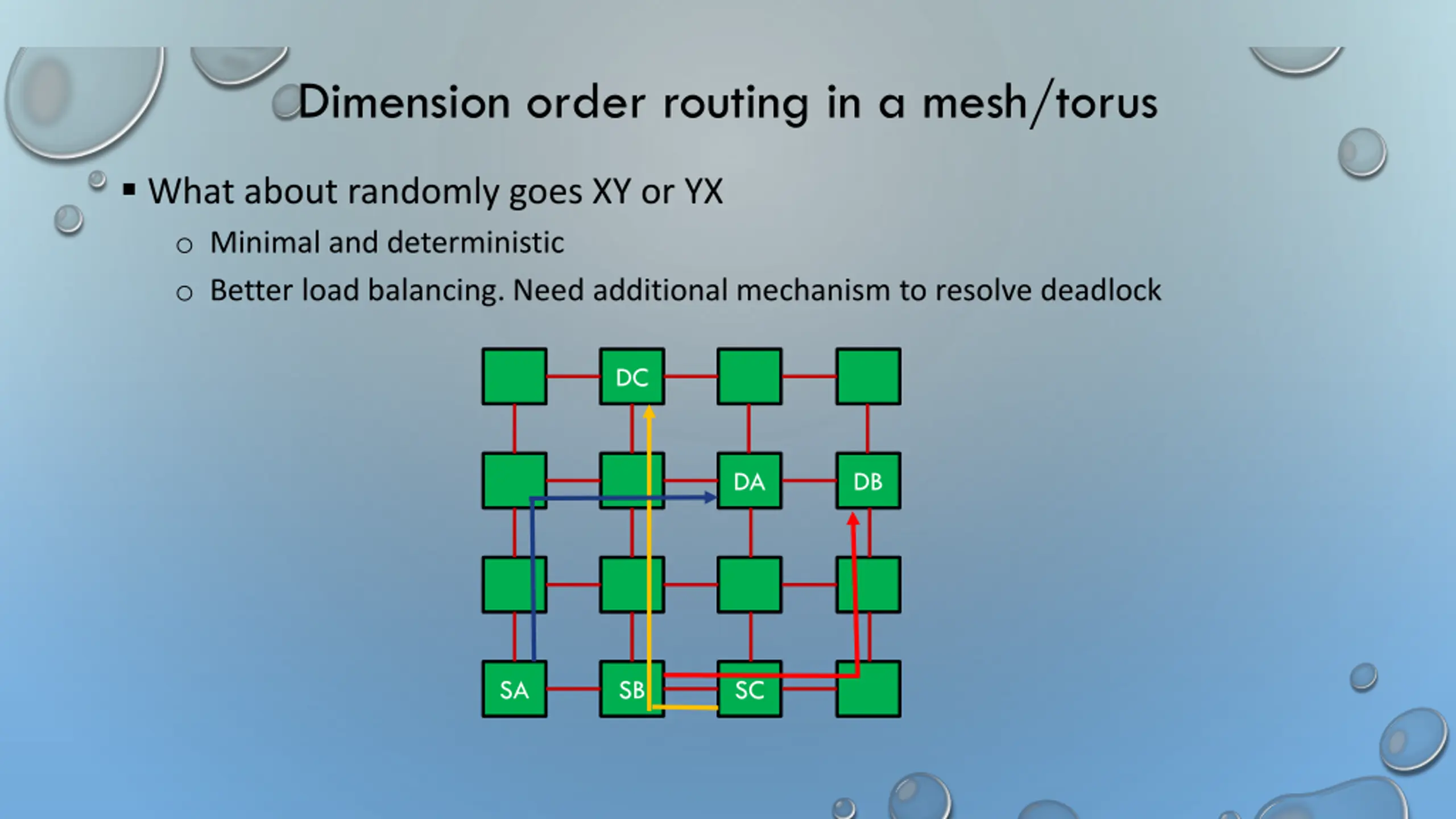 Dimension order routing in a mesh/torus What about randomly goes XY or YX o Minimal and deterministic o Better load balancing. Need additional mechanism to resolve deadlock DC DA DB SA SB SC
