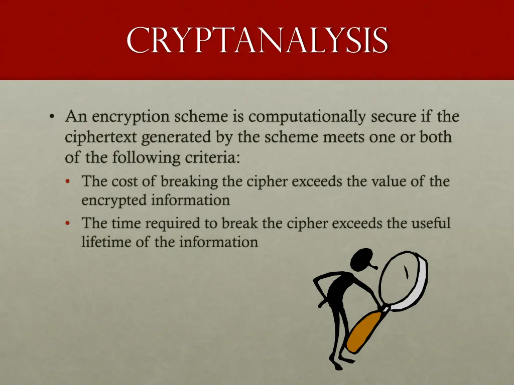 cryptanalysis An encryption scheme is computationally secure if the ciphertext generated by the scheme meets one or both of the following criteria: The cost of breaking the cipher exceeds the value of the encrypted information The time required to break the cipher exceeds the useful lifetime of the information
