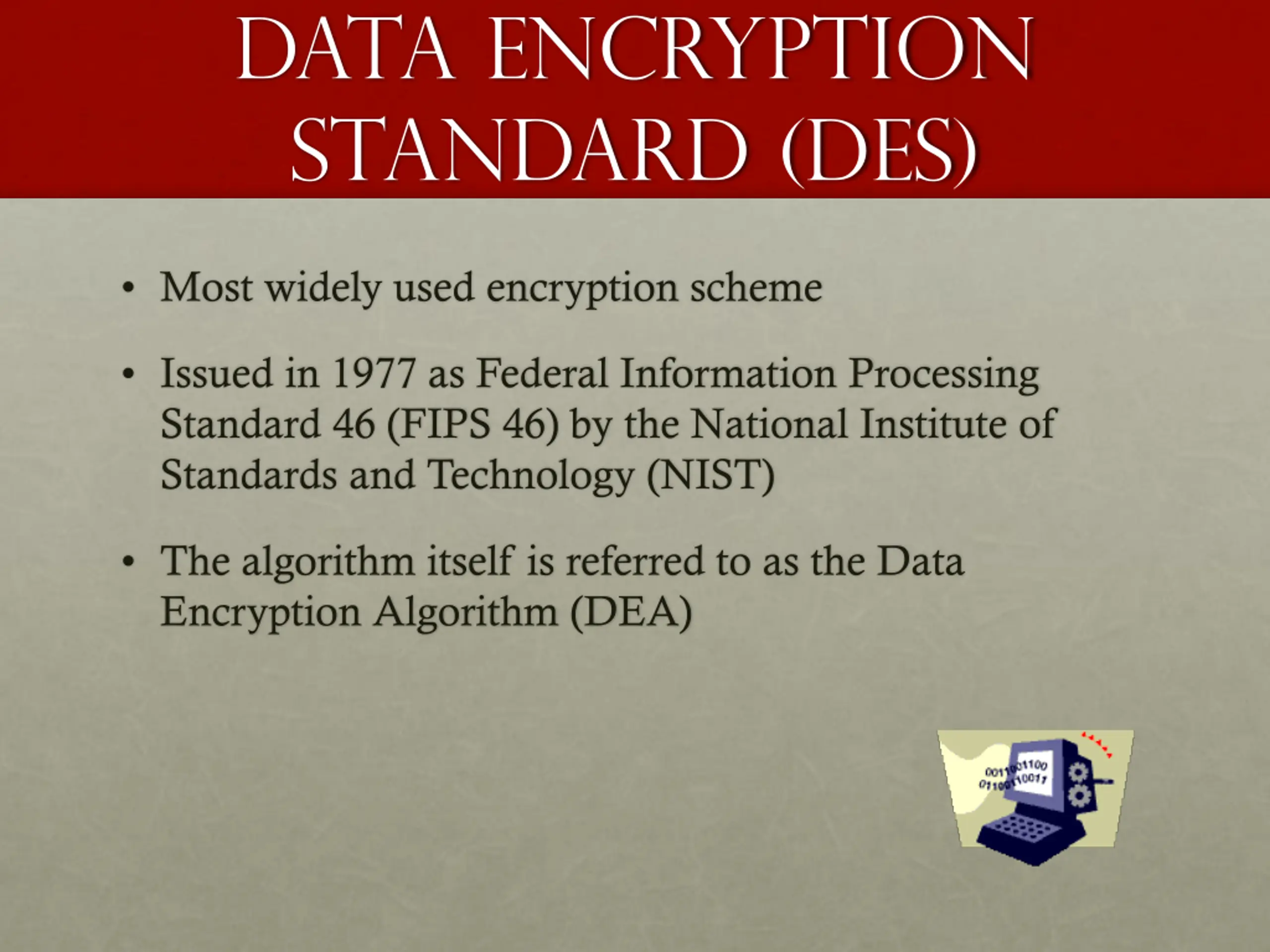 Data Encryption Standard (DES) Most widely used encryption scheme Issued in 1977 as Federal Information Processing Standard 46 (FIPS 46) by the National Institute of Standards and Technology (NIST) The algorithm itself is referred to as the Data Encryption Algorithm (DEA)