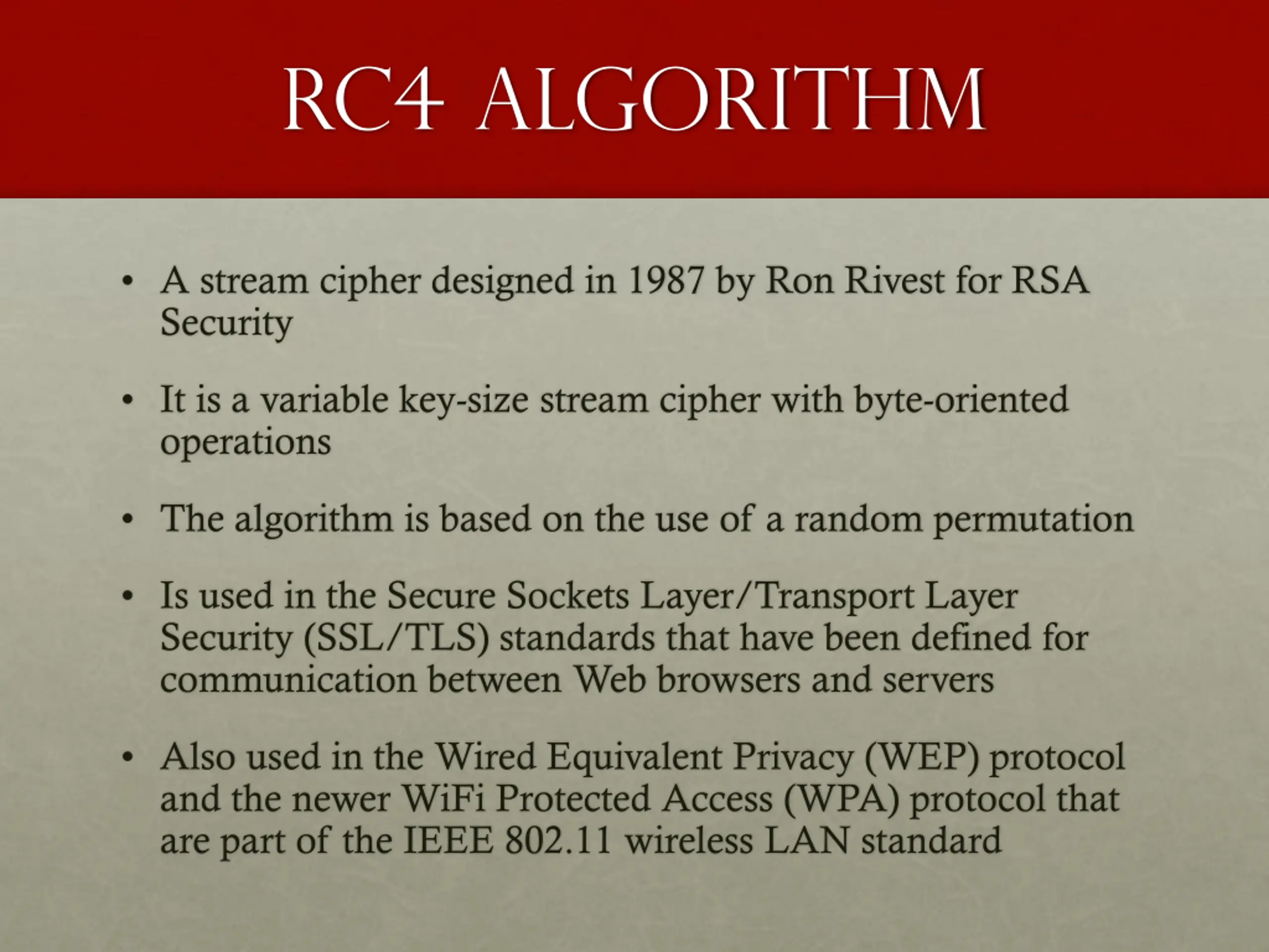 RC4 algorithm A stream cipher designed in 1987 by Ron Rivest for RSA Security It is a variable key-size stream cipher with byte-oriented operations The algorithm is based on the use of a random permutation Is used in the Secure Sockets Layer/Transport Layer Security (SSL/TLS) standards that have been defined for communication between Web browsers and servers Also used in the Wired Equivalent Privacy (WEP) protocol and the newer WiFi Protected Access (WPA) protocol that are part of the IEEE 802.11 wireless LAN standard
