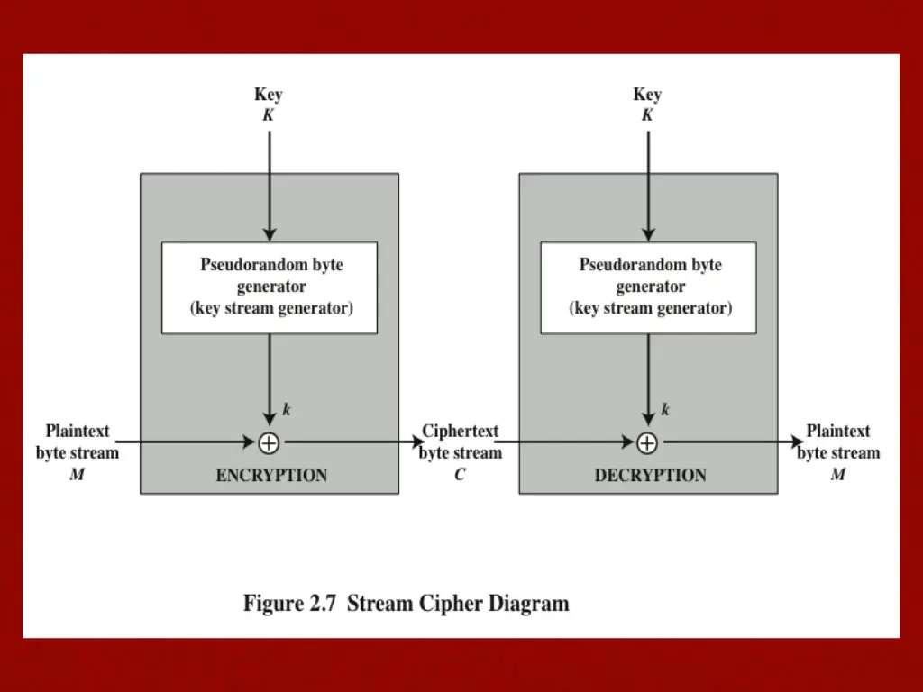 Stream Cipher design considerations The encryption sequence should have a large period The longer the period of repeat, the more difficult it will be to do cryptanalysis The keystream should approximate the properties of a true random number stream as close as possible The more random-appearing the keystream is, the more randomized the ciphertext is, making cryptanalysis more difficult The pseudorandom number generator is conditioned on the value of the input key To guard against brute-force attacks, the key needs to be sufficiently long With current technology, a key length of at least 128 bits is desirable