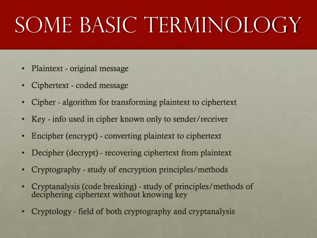 Some Basic Terminology Plaintext - original message Ciphertext - coded message Cipher - algorithm for transforming plaintext to ciphertext Key - info used in cipher known only to sender/receiver Encipher (encrypt) - converting plaintext to ciphertext Decipher (decrypt) - recovering ciphertext from plaintext Cryptography - study of encryption principles/methods Cryptanalysis (code breaking) - study of principles/methods of deciphering ciphertext without knowing key Cryptology - field of both cryptography and cryptanalysis
