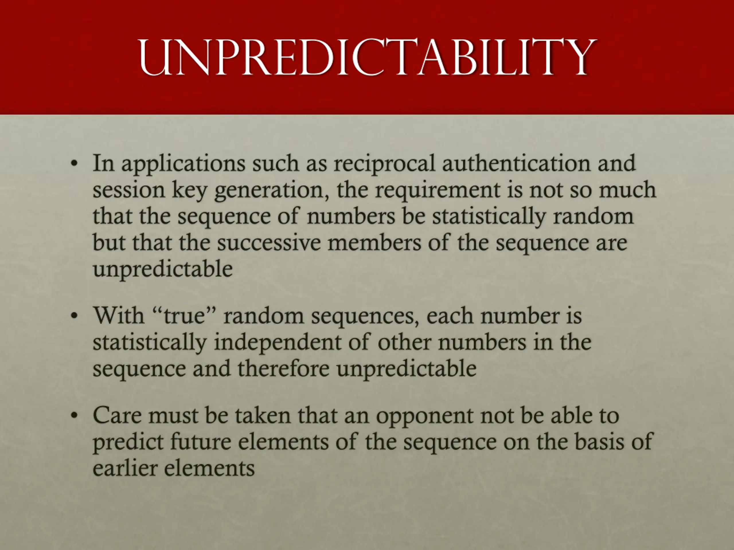 unpredictability In applications such as reciprocal authentication and session key generation, the requirement is not so much that the sequence of numbers be statistically random but that the successive members of the sequence are unpredictable With true random sequences, each number is statistically independent of other numbers in the sequence and therefore unpredictable Care must be taken that an opponent not be able to predict future elements of the sequence on the basis of earlier elements